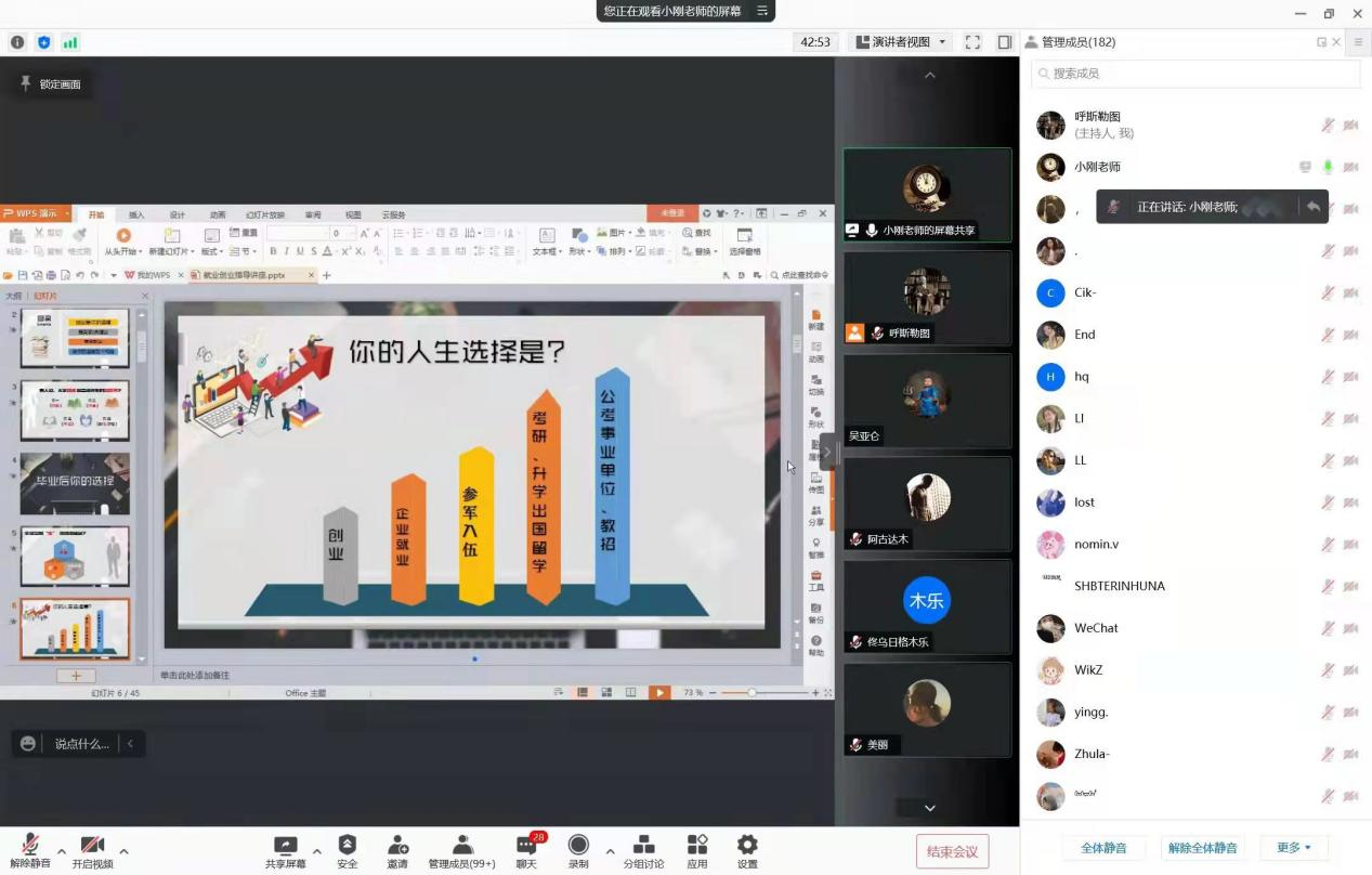 12月14日晚,邀请“就业创业服务导航”微信公众号创办人常小刚,举办“我的人生我做主”线上专题辅导讲座。马克思主义学院党总支副书记韩琼、辅导员呼斯勒图及我院学生181人参加了培训。