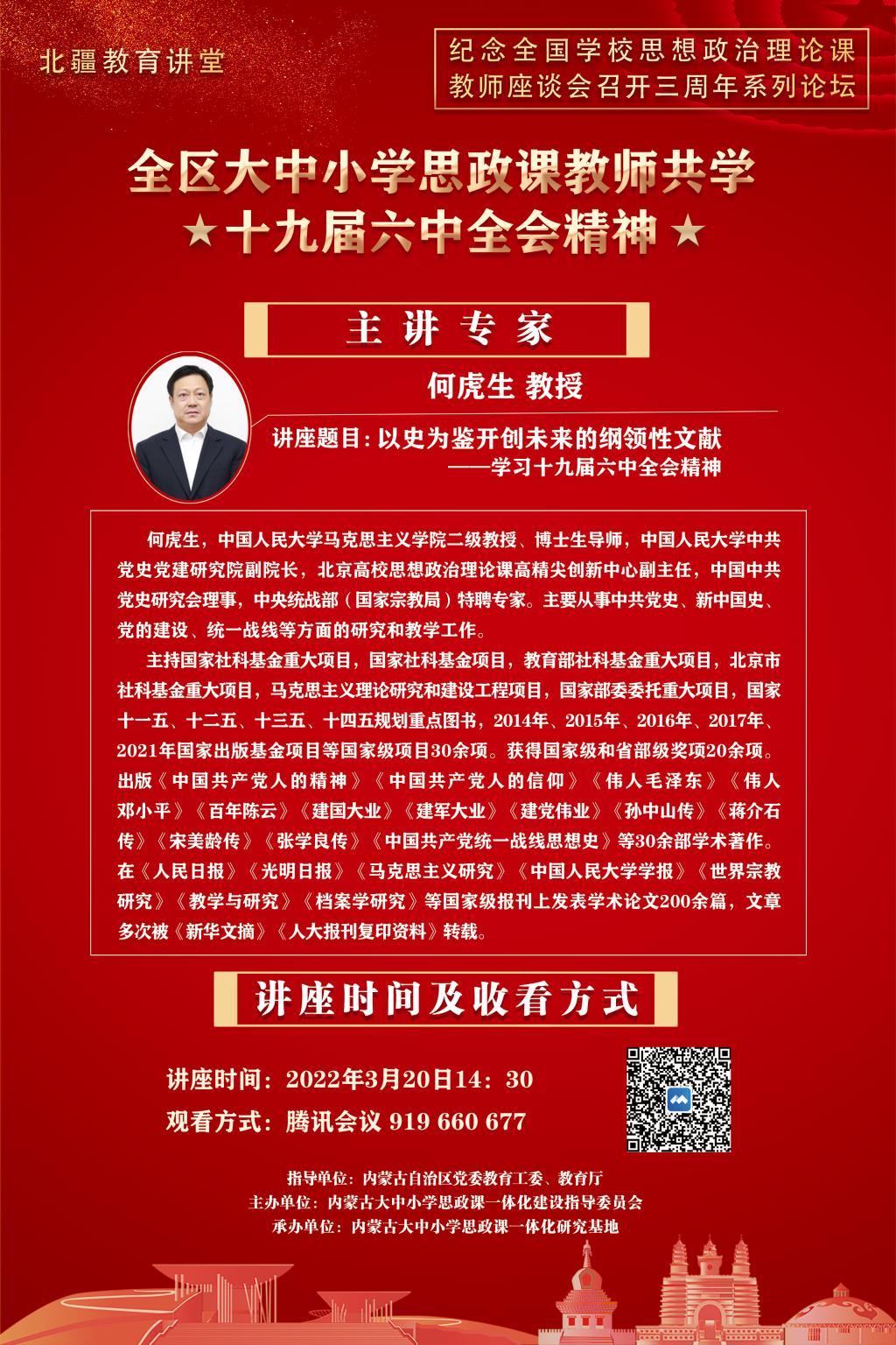 3月20日下午,北疆教育讲堂邀请中国人民大学何虎生教授作了题为《以史为鉴开创未来的纲领性文献——学习十九届六中全会精神》的专题辅导讲座,365英国上市公司组织全体思政课教师在线收看。