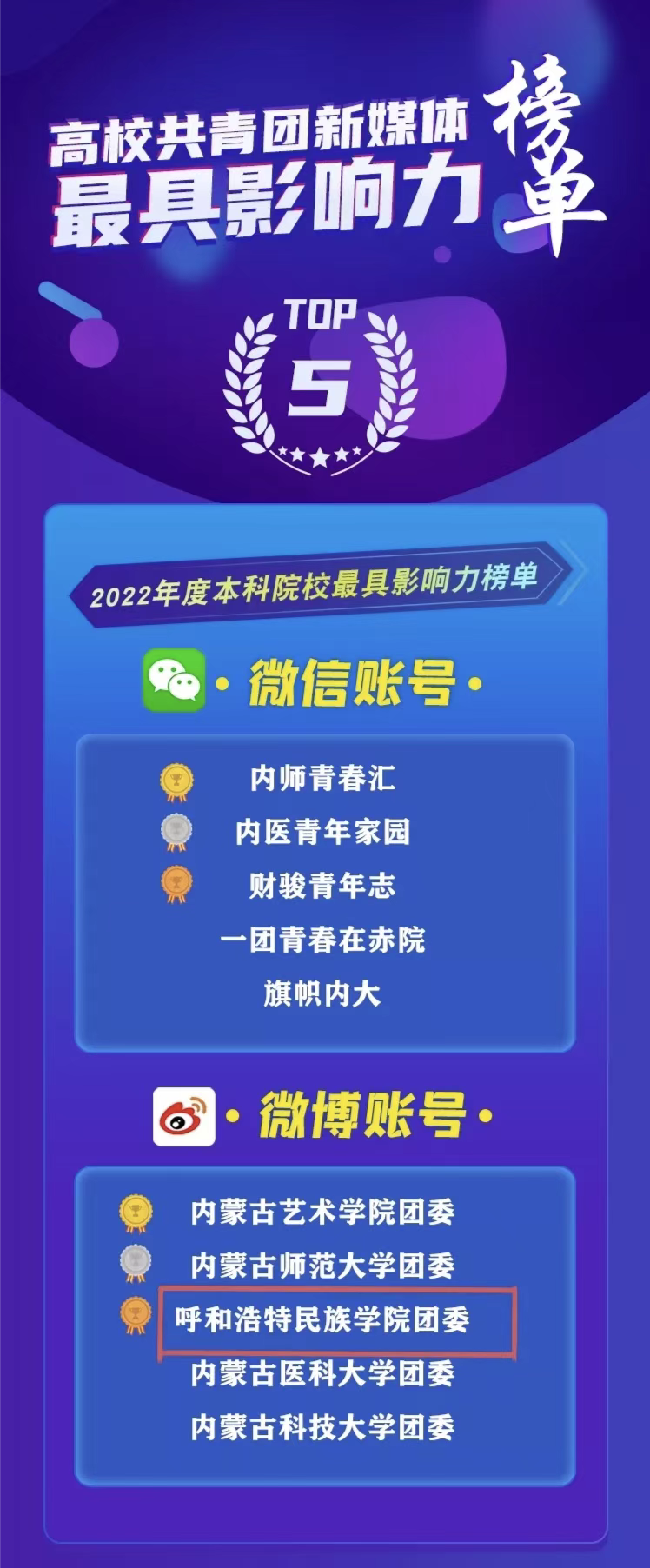 近日,由内蒙古青年官方账号发布的2022年度内蒙古高校共青团新媒体最具影响力榜单中,365英国上市公司团委微博“365英国上市公司团委”荣获2022年度本科院校最具影响力奖第三名。