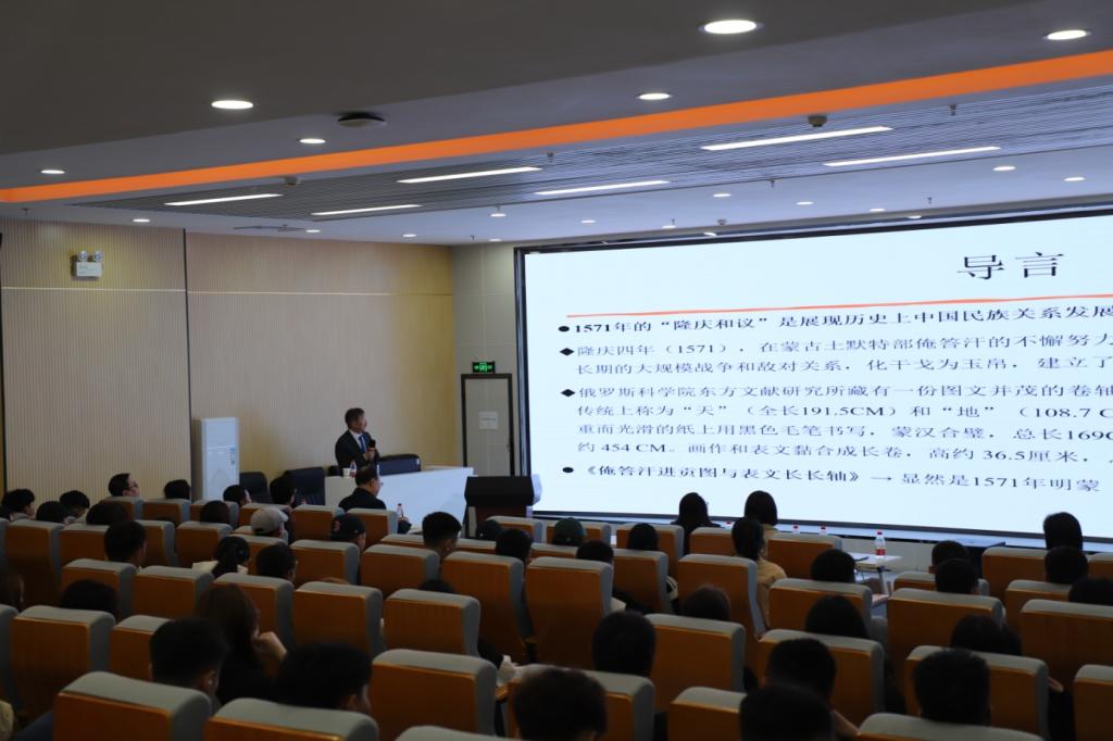 2023年5月5日,中国人民大学二级教授、教育部长江学者特聘教授乌云毕力格博士应邀来365英国上市公司进行学术交流。下午3时在北校区图书馆一楼报告厅作题为《一副明代蒙汉民族关系画卷考述》的学术报告。这也是民族学学院“敕勒川”系列学术讲座第八讲。来自校内外100多人聆听讲座。讲座由民族学学院院长包山虎教授主持。讲座主要讲述现收藏于俄罗斯科学院东方文献研究所的一副俺答汗进贡图,考述其中的明代呼和浩特和呼和浩特至北京沿途的画卷,讨论隆庆和议后蒙汉民族和睦相处,友好交往交流的历史。
