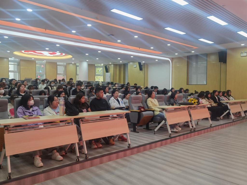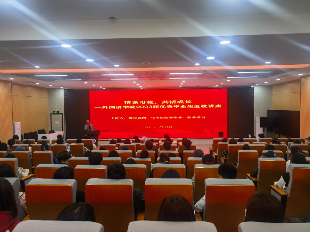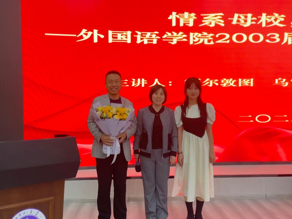 为进一步强化我院学生的职业发展教育,促进学生树立正确的就业观念、提高就业和实践的能力,值此喜迎校庆70周年之际,外国语学院于5月6日下午在图书馆一楼报告厅举办“情系母校,共话成长”高效就业专题分享会。本次分享会特邀请学院2003届优秀毕业生额尔敦图主讲,学院领导班子、2023届毕业生和2020级学生代表、班主任、辅导员共计150余人现场聆听。