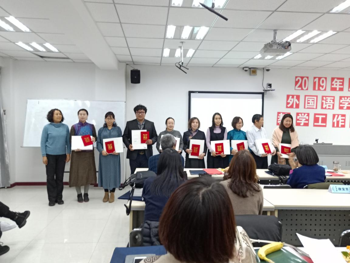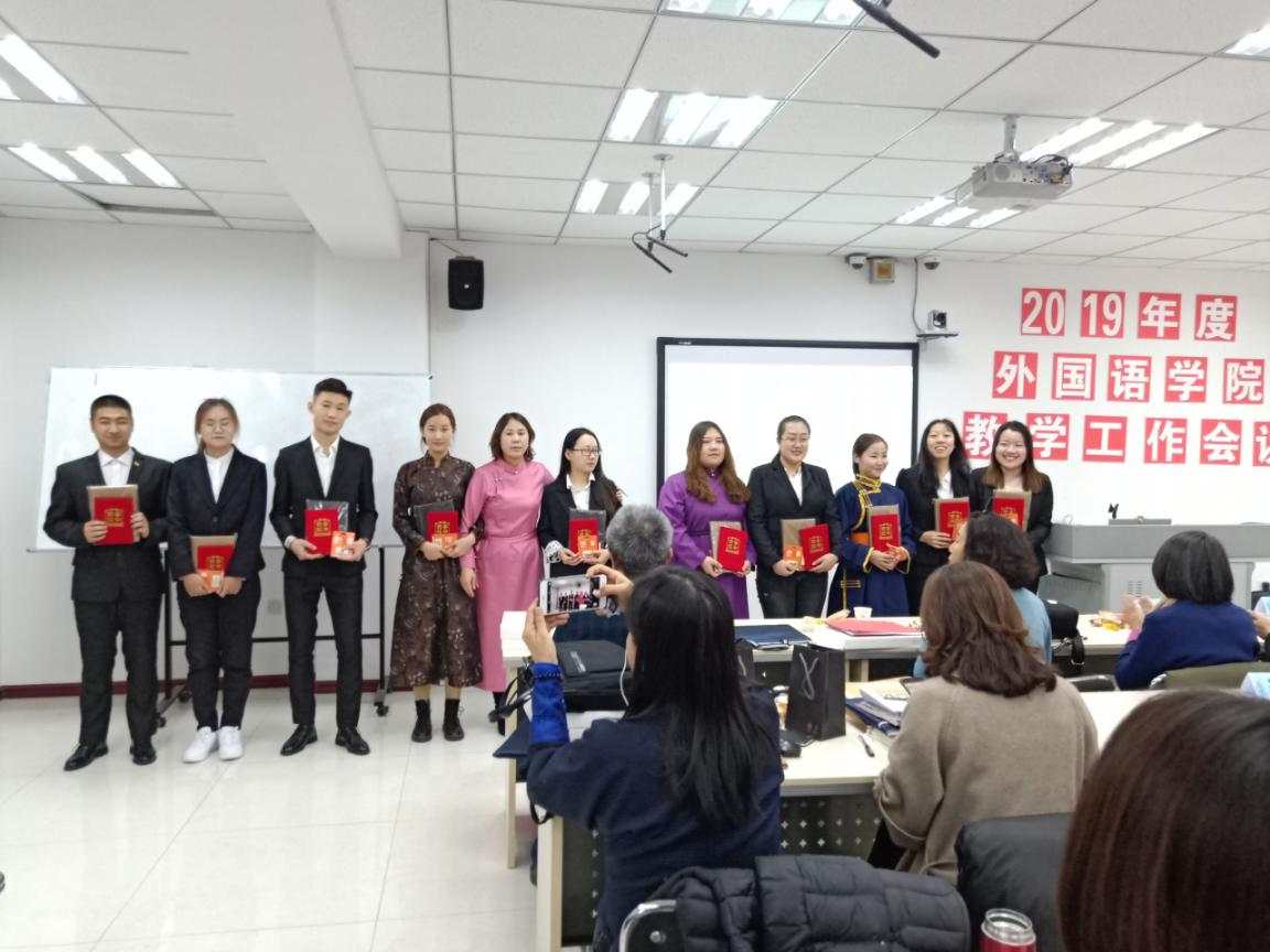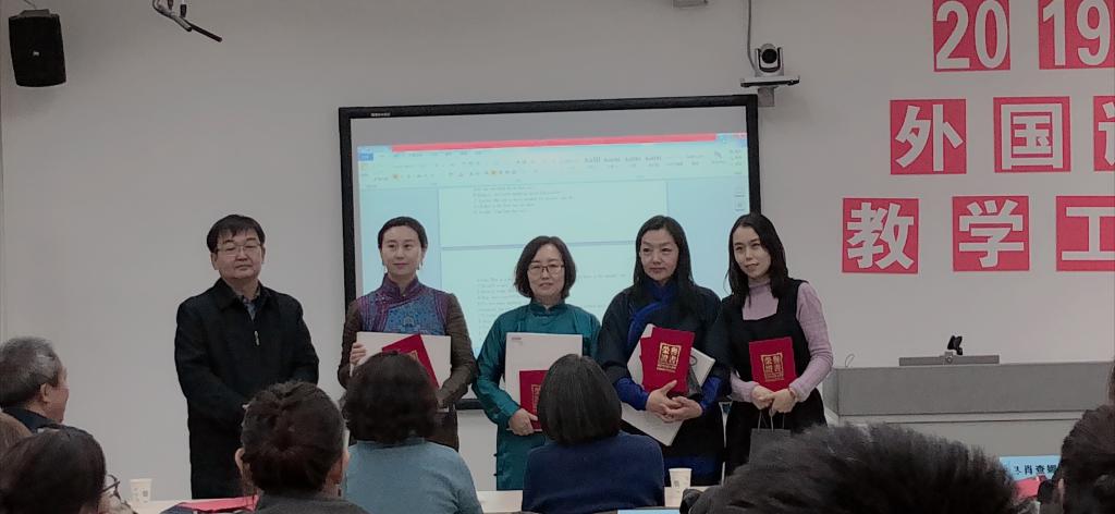 随后,教师代表萨仁格日乐教授、吴丹讲师、涛歌副教授分别作了题为《<英语漫谈蒙古文化>慕课建设与研究》《对申报教学成果奖的几点思考》《微课在民族院校英语口语课程中的应用研究》的报告。接着,由党总支副书记红梅宣读《外国语学院关于表彰2015——2019年度教育教学工作先进个人和优秀学生干部的决定》,并邀请颁奖嘉宾为受表彰师生颁发了证书和奖品。
