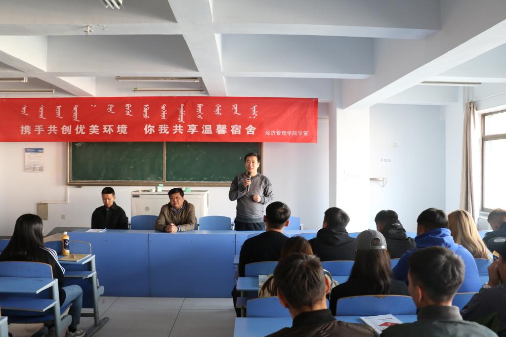 活动开始,专职辅导员邵建朝老师宣读了《经济管理学院宿舍文化月活动策划书》,并传达了本次活动对学生宿舍卫生的具体要求。随后由学生干部代表和优秀宿舍代表上台发言,强调保持宿舍卫生的重要性,表决心将在宿舍文化月活动中起到表率作用。学生代表发言后,乌日根巴雅尔老师对宿舍文化月活动的方案做了解读,对班长和宿舍长的职责做了明确部署。最后,党总支书记赛音图作了总结发言,强调了宿舍文化月活动开展的意义,对学生干部们给予了支持和鼓励。