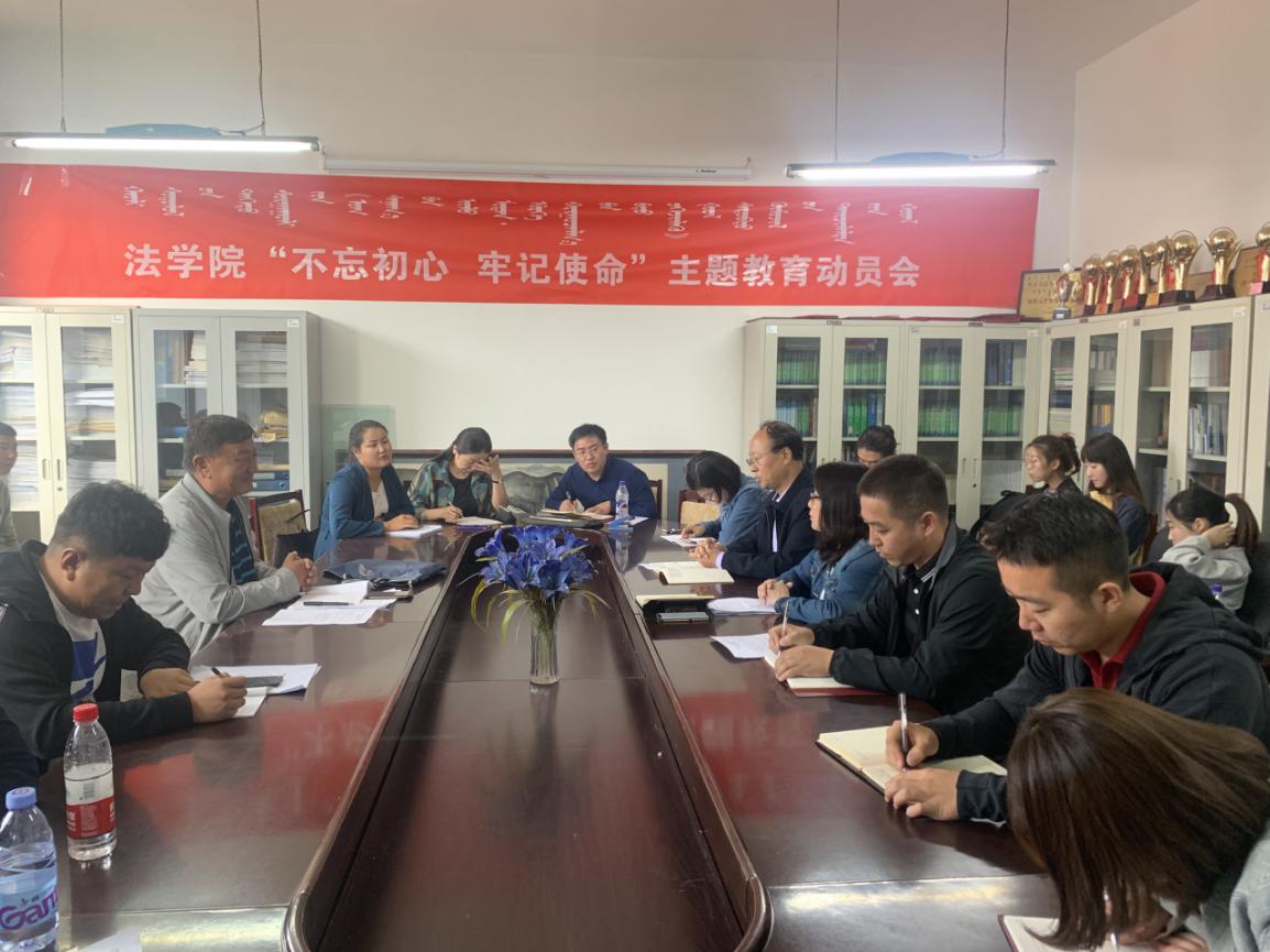 乌兰其其格书记针对主题教育作动员讲话,要求法学院全体师生党员提高政治站位,从思想上深刻认识主题教育的重大意义;从行动上切实发挥共产党员的先进模范作用,认真落实主题教育的总体目标和具体任务;从结果上,把本次活动当做一次自我提升和提高的机会,结合自己的实际工作,静下心来学习教育、俯下身子调查研究、实事求是检视问题、扎扎实实整改落实。乌书记并向指导组作表态发言:一定带领全院师生党员做好此次主题教育,率先垂范、以身作则,在力求实效上下功夫。