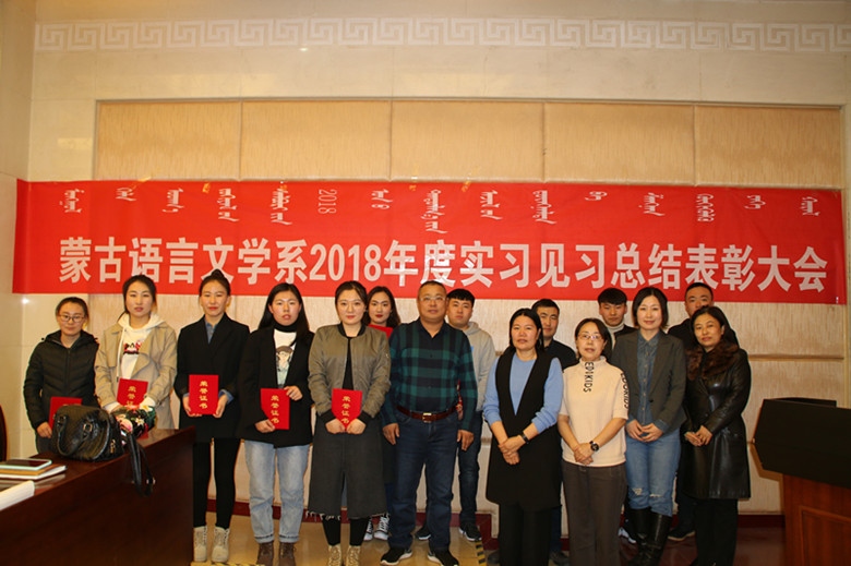 近日,蒙古语言文学系2018年度实习见习总结表彰大会在图书馆一楼报告厅举行。蒙古语言文学系党总支书记周双喜、系副主任苏布道、实习见习指导老师、实习见习生及部分师生参加,会议由办公室副主任阿力坦斯那嘠主持。