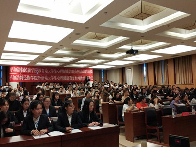 为增强大学生心理适应能力和问题应对能力,号召大学生关注心理健康,培育理性平和的健康心态, 6月13日19时, 外语系、教育系在图书馆一楼报告厅联合举办2018年大学生心理健康教育活动启动仪式暨大学生心理健康教育知识竞赛决赛。教育系朝鲁副教授、胡宝泉副教授、团总支安梅琴,马列教研部学工办主任白宝花,外语系团总支韩争运参加启动仪式并担任本次决赛评委。各班心理委员及部分参赛系(部)学生代表近200人参加活动。