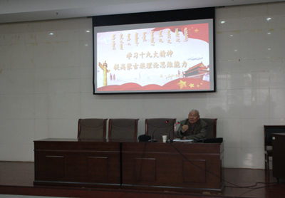 为深入学习贯彻党的十九大精神,提高理论思维能力,12月14日15时,法律系邀请内蒙古师范大学格•孟和教授在图书馆三楼模拟法庭作了题为《学习十九大精神,提高蒙古族理论思维能力》的专题讲座。讲座由法律系主任包山虎主持,全系教师和法学专业学生代表共计60余人参加。