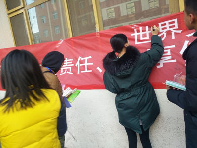 活动现场张贴本次“世界艾滋病日”的主题“共担防艾责任,共享健康权力,共建健康中国”宣传横幅,并号召同学们在横幅上签名,共同为防艾事业做出郑重承诺。另外通过发放宣传折页、传单、扑克牌、笔记本等小礼品向学生们宣传艾滋病的危害,提高防艾意识和自我保护能力,并在学校宣传板张贴预防艾滋病知识海报进一步宣传预防艾滋病的相关知识。