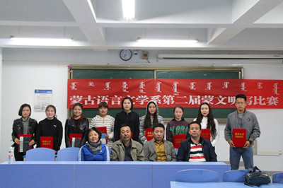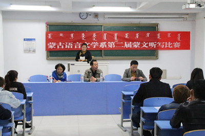 为庆祝内蒙古自治区成立70周年,进一步弘扬蒙古族优秀传统文化,改善多数人提笔忘字的现象,丰富广大学生的课余生活,提高书写能力, 2017年5月5日晚19:30,在都林楼418教室举行了蒙文听写比赛。本次大赛由蒙古语言文学系团总支主办、学生会承办。 蒙古语言文学系王桂荣教授、套格敦白乙拉教授、额日德木图副教授担任了本次比赛的评委。来自15个系部的78位选手参加了比赛。