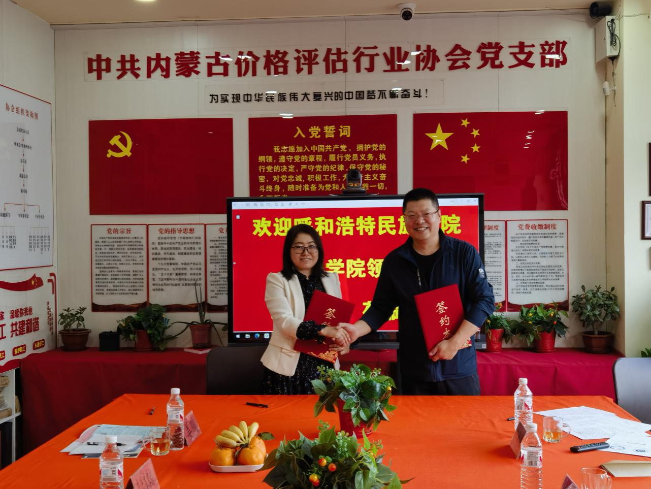 双方就人才培养、就业实习、党建共建等合作事宜进行了深入的座谈。座谈会上,价格评估行业协会会长云金平对乌兰其其格一行的到来表示热烈欢迎,并详细介绍了协会的基本情况、发展历程以及未来发展规划,并充分考虑了学院和企业双方的优势,积极适应新时代产教融合战略升级需要,经双方友好协商,达成战略合作。乌兰其其格表示,近几年学院为了给学生提供更开阔的就业渠道和更多选择,始终坚持以市场需求为导向,紧密对接行业企业需求,不断优化专业设置提高人才培养质量,提升学生的就业竞争力,和对双方加深合作领域的美好展望,希望与价格评估行业协会在人才培养、就业创业、党建共建等方面开展深度合作,推动学院人才培养质量的优化,进一步拓展学生的就业领域。随后双方签订了战略合作协议,共同揭牌建立了就业实训基地。