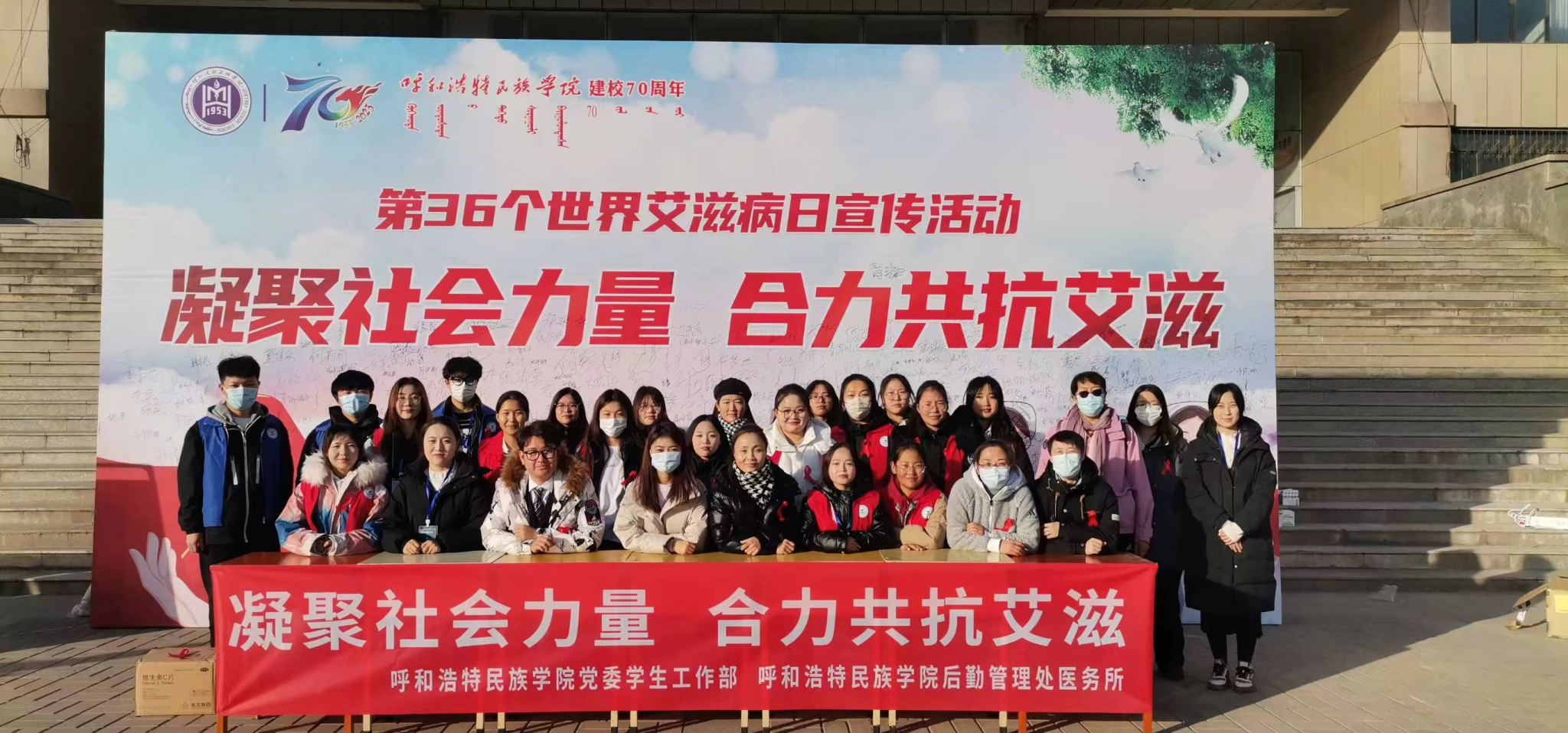 为进一步增强学生对艾滋病防治知识的了解,切实提高自我保护意识,有效遏制艾滋病在学生人群中传播,11月26日,学校党委学生工作部、后勤管理处联合开展了“凝聚社会力量,合力共抗艾滋”主题的世界艾滋病日宣传活动。呼和浩特市新城区疾病预防控制中心领导、学校党委学工部负责人、后勤管理处负责人、医务所全体医护人员、学校健康促进会全体成员及各二级学院学生代表参加了活动。