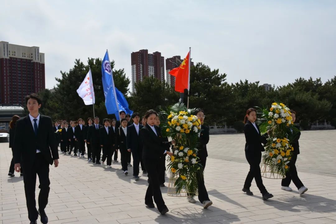 在庄严肃穆的烈士纪念碑前,全体师生整齐列队,向英烈们敬献鲜花,肃立默哀,深切表达对革命先烈们的追思之情。随后,师生们以深情的朗诵表达对烈士们无尽的哀思与怀念。