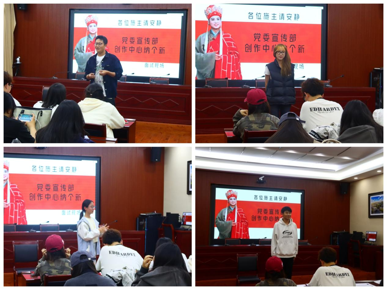 为进一步强化学校宣传工作队伍建设,更好展现民院学子积极向上的风貌,宣传部创作中心于9月26日至10月10日在办公楼四楼与尚智楼325教室依次开展两轮纳新面试工作。
