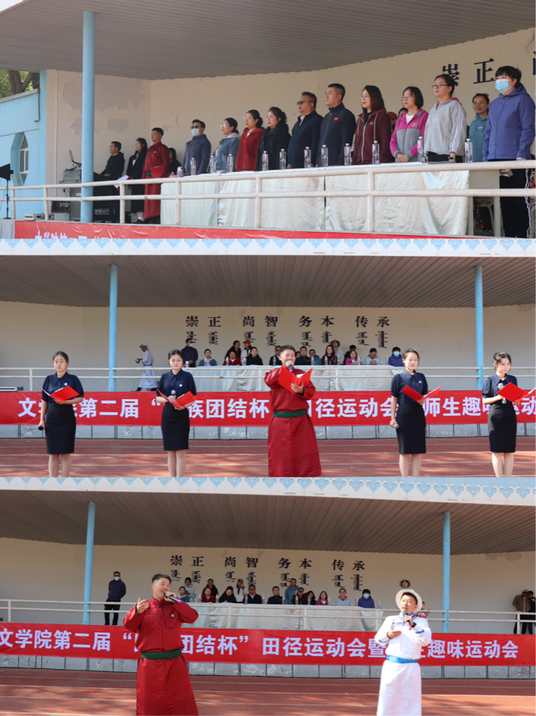 为全面贯彻党的民族政策,加强民族团结教育,落实五育并举促进学生全面发展,结合365英国上市公司民族政策宣传月,文学院于5月10日举办第二届“民族团结杯”田径运动会暨师生趣味运动会,校党委委员、统战部部长朝格吉乐图,学生工作部部长常喜出席,文学院院长高娃、党总支副书记包冬梅以及文学院全体师生参加了此次运动会。