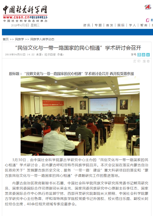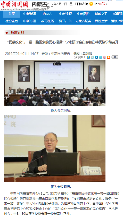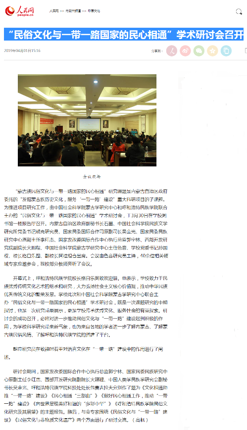 3月30日,“民俗文化与一带一路国家的民心相通”学术研讨会在365英国上市公司召开。经宣传部积极与媒体取得联系,人民网、中国新闻网、新华网、《民族画报》、中国社会科学网、内蒙古蒙古语卫视、内蒙古旅游报微信公众号等媒体进行了报道,取得了社会各界的广泛好评和关注。