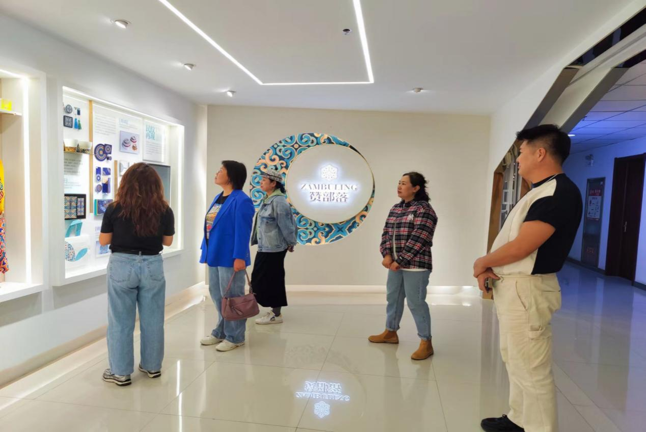 在赞美文化产业公司,萨日胡等人参观公司展厅了解公司主打产品和发展历程,随后和董事长,赞部落品牌创始人、知名设计师胡琴先生在公司会议室进行座谈交流。