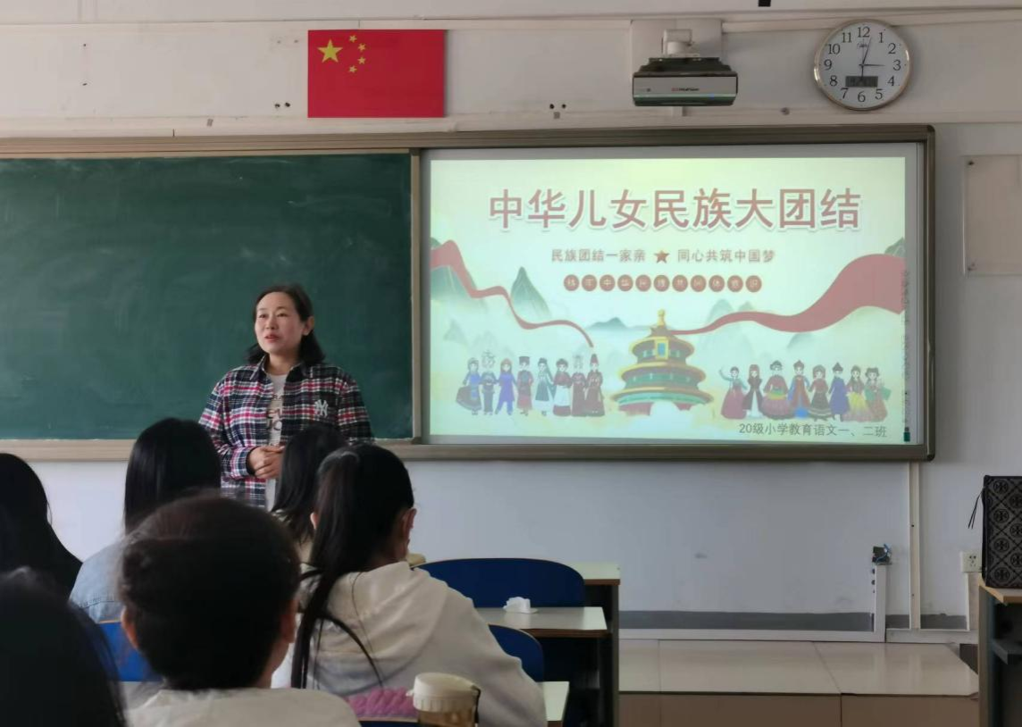 20级小学教育语文一、二班开展铸牢中华民族共同体意识主题班会,引导学生深入理解中华民族共同体意识的内涵,增强学生的民族自豪感和国家认同感,班主任王玉霞老师为全体同学讲解中华民族共同体意识的概念和现实意义,组织学生讨论探讨如何培养中华民族共同体意识。引导学生从个人做起,从身边小事做起,如尊重其他民族的风俗习惯、积极参与民族团结进步活动分享,一些中华民族共同体意识的优秀案例,如各民族共同抗击自然灾害、共同传承民族文化等,让学生感受到中华民族共同体意识的强大力量。