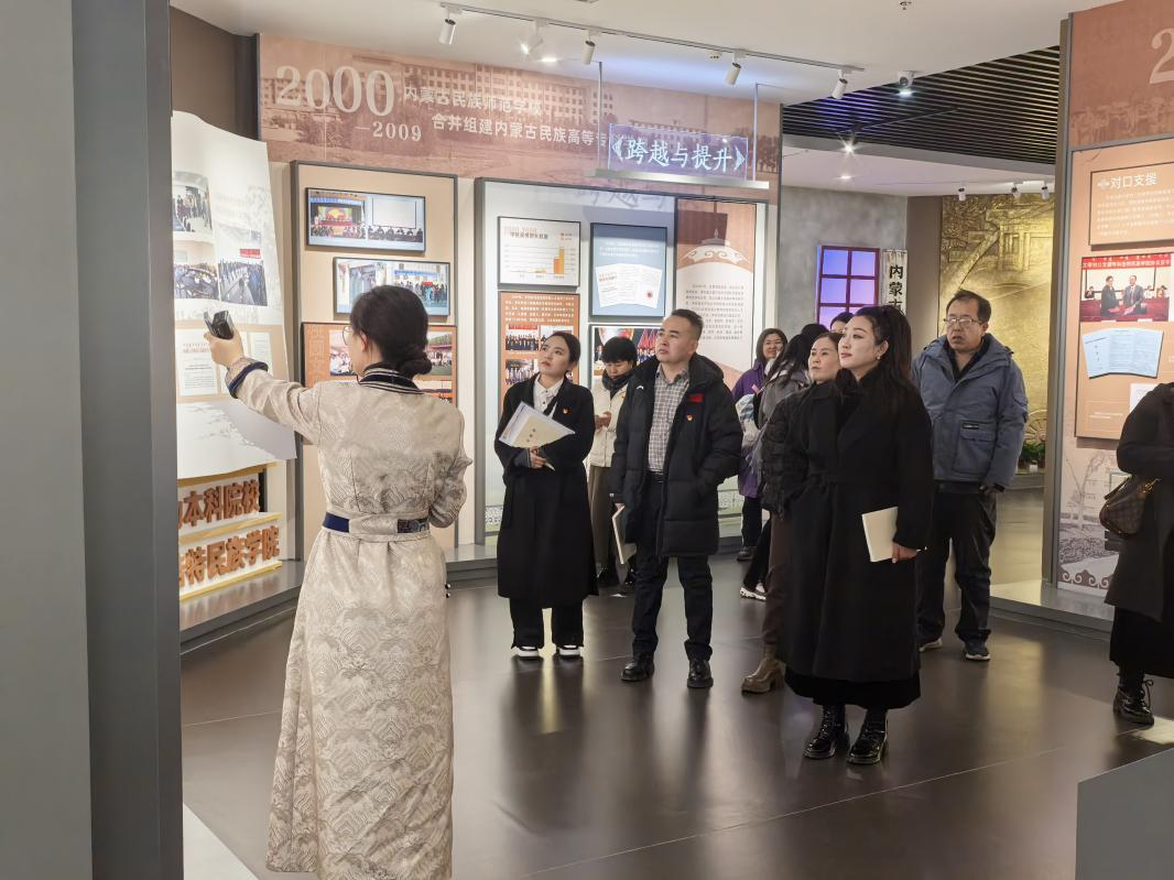 12月6日,呼和浩特市蒙古族幼儿园园长王美红一行,来校参观学校铸牢中华民族共同体意识教育馆。教育学院副院长朱乌英嘎和办公室相关人员陪同。