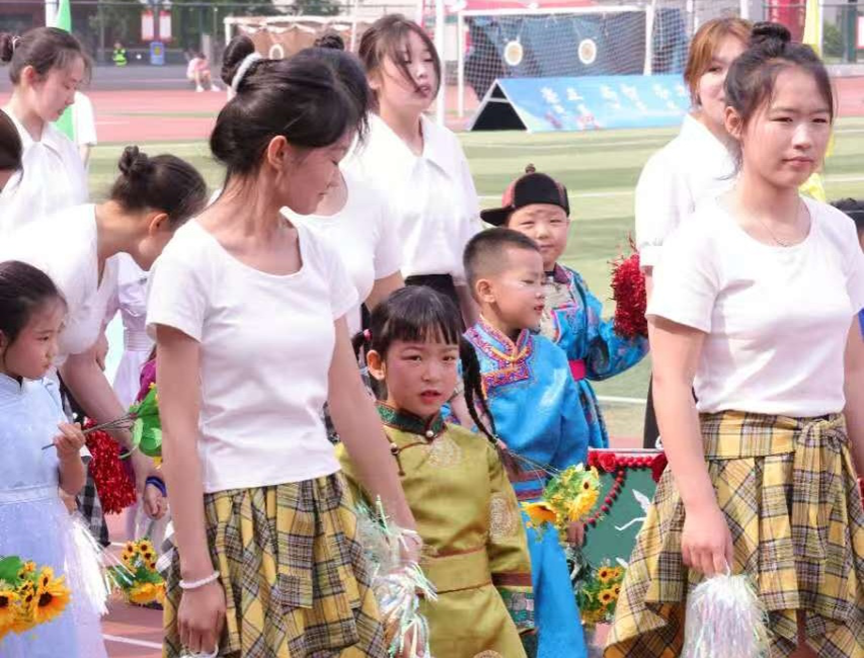 上午8:30,伴随着欢快的音乐,教育学院学生与幼儿园小朋友们手牵手步入运动场。孩子们身着蒙古袍,手持彩色捧花,在大学生姐姐们的带领下,表演了充满活力的啦啦操《你要跳舞吗》。他们天真烂漫的笑容和活泼可爱的动作,瞬间点燃全场热情,成为开幕式上一道亮丽的风景线。教育学院领导表示:“邀请幼儿园小朋友参与开幕式,也为我们增添了许多欢乐氛围。”