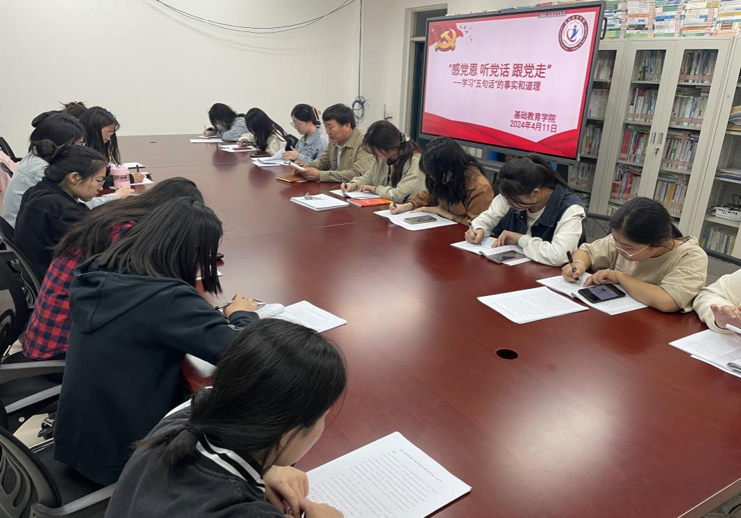 “感党恩 听党话 跟党走”基础教育学院学支部专题学习“五句话”的事实和道理 2024年4月11日,基础教育学院学生党支部组织全体党员会议,党支部书记常志君领学了“五句话”的事实和道理,深刻认识、牢牢铭记“五句话”内涵和意义。之后全体学生党员结合相关历史史料,进行了讨论交流。 通过本次专题学习,学生党员们对内蒙古自治区的历史和发展有了系统的了解,对“五句话的事实和道理”也有了更清晰的认识。 最后,学生党支部书记常志君对全体学生党员提出要求,要深刻认识、牢牢铭记“五句话”的事实和道理,领会其精髓要义,进一步增强广大学生党员“感党恩、听党话、跟党走”的思想自觉和行动自觉。