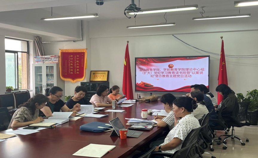 为进一步加强警示教育,强化党员干部廉洁自律意识,筑牢党员干部廉政思想防线,6月3日,基础教育学院、学前教育学院在都林楼405会议室开展理论中心组(扩大)党纪学习教育读书班暨“以案说纪”警示教育主题党日活动,基础教育学院党总支负责人萨日胡主持,基础教育学院院长崔凤珍、副院长额尔敦其其格,学前教育学院副院长其其格、副院长朱乌音嘎及两学院中心组成员、全体党员参加。