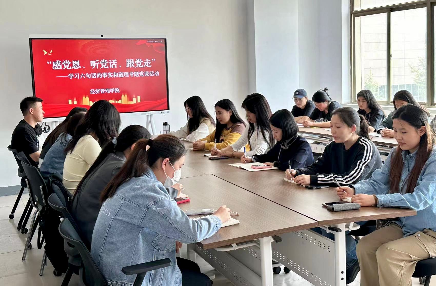 为推动“感党恩、听党话、跟党走”教育实践活动,深入学习“六句话的事实和道理”,引导学生深刻理解习近平同志为核心的党中央对内蒙古的关怀厚爱。4月19,学院开展了“感党恩、听党话、跟党走”——学习六句话的事实和道理”为主题的专题党课。学生党员、发展团员40余人参加此次党课。