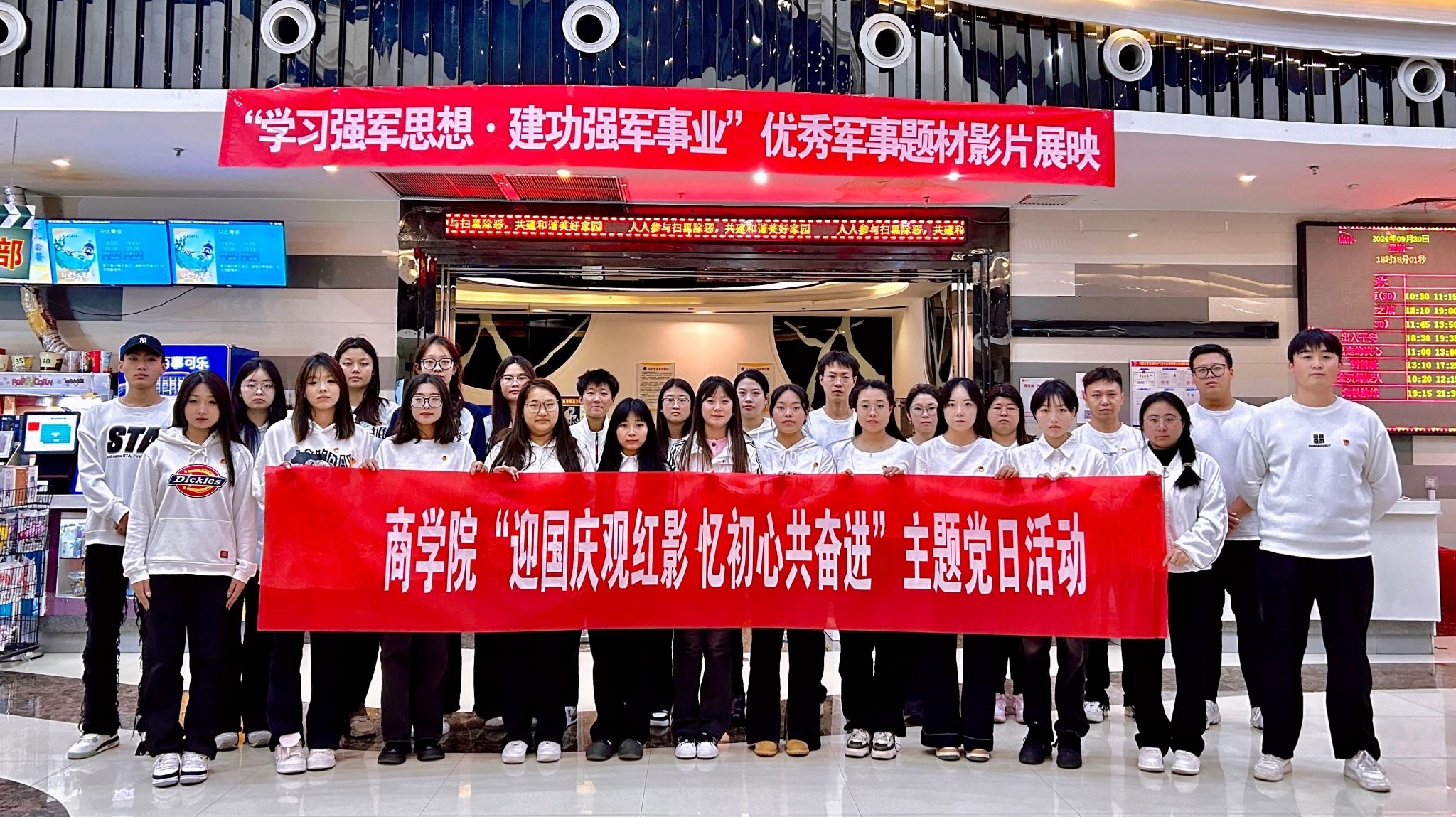 在中华人民共和国成立75周年来临之际,为深入学习贯彻党的二十届三中全会精神,不断提高基层党组织的战斗力和凝聚力,引导全体学生党员切实增强宗旨意识和政治情怀,9月30日,商学院学生党支部开展“迎国庆观红影 忆初心共奋进”主题党日活动。30余名学生党员共同观看爱国主义影片《志愿军2》。