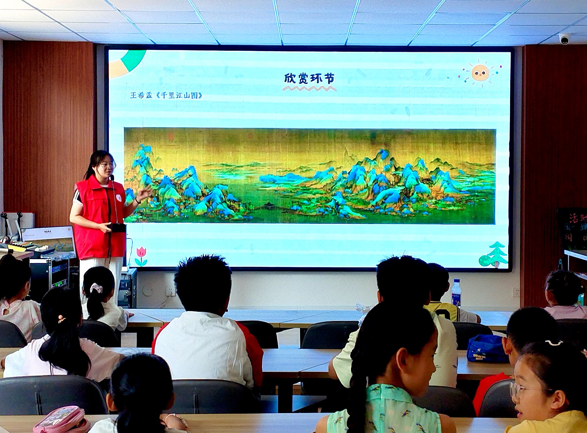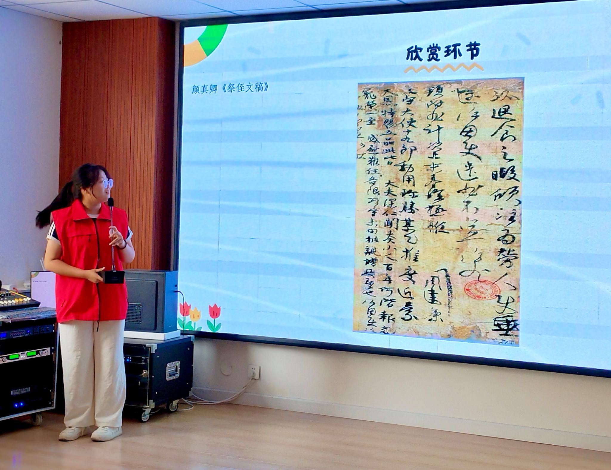活动现场,青年志愿者与孩子们齐聚一堂。“书绘千秋韵”环节,志愿者借助屏幕展示经典,从颜真卿《祭侄文稿》的苍劲笔锋,到王希孟《千里江山图》的壮丽山河,用生动讲解使孩子们领略了书法的气韵、绘画的意境,在孩子们心中播撒传统文化的种子。