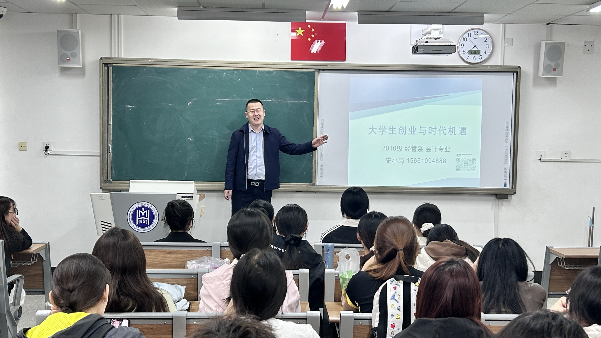 此次讲座中,史小岗深情回顾了在商学院求学的点滴感恩母校的培养与老师的谆谆教诲大学生创业与时代机遇”为主题,结合自身从校园到职场的成长轨迹,分享了奋斗历程与人生感悟结合自身经历,从职业规划、能力提升、心态调整三个维度展开分享在职业规划上,他建议学弟学妹们立足专业特色,结合市场需求,明确发展方向;在能力提升方面,他强调既要夯实专业基础,也要注重沟通协作、实践锻炼等综合能力的培养;在心态调整上,他鼓励同学们保持积极向上的心态,以开放包容的姿态面对挑战,在挫折中积累经验。