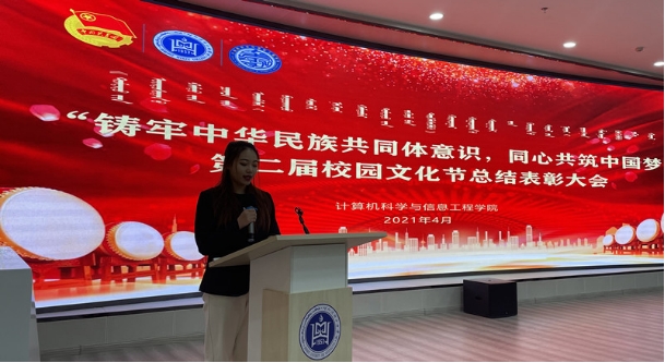 最后,学生会徐爽进行动员讲话,号召广大同学们积极参加民族团结进步教育活动,铸牢中华民族共同体意识,通过学习党史,坚定理想信念,立志把个人梦想融入实现中国梦的伟大实践中。