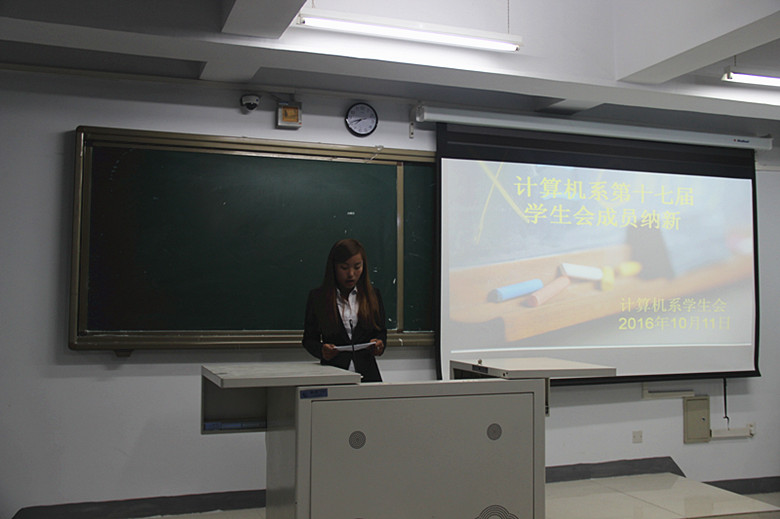 2016年10月11日晚,计算机系第十七届学生会成员纳新活动在都林楼312室举行。活动由上一届系学生会主席吴海玲主持。出席本次活动的有计算机系团总支书记白银亮,16级预科班班主任吴玲玲,学生会各部成员,以及计算机系2016届全体大一新生。