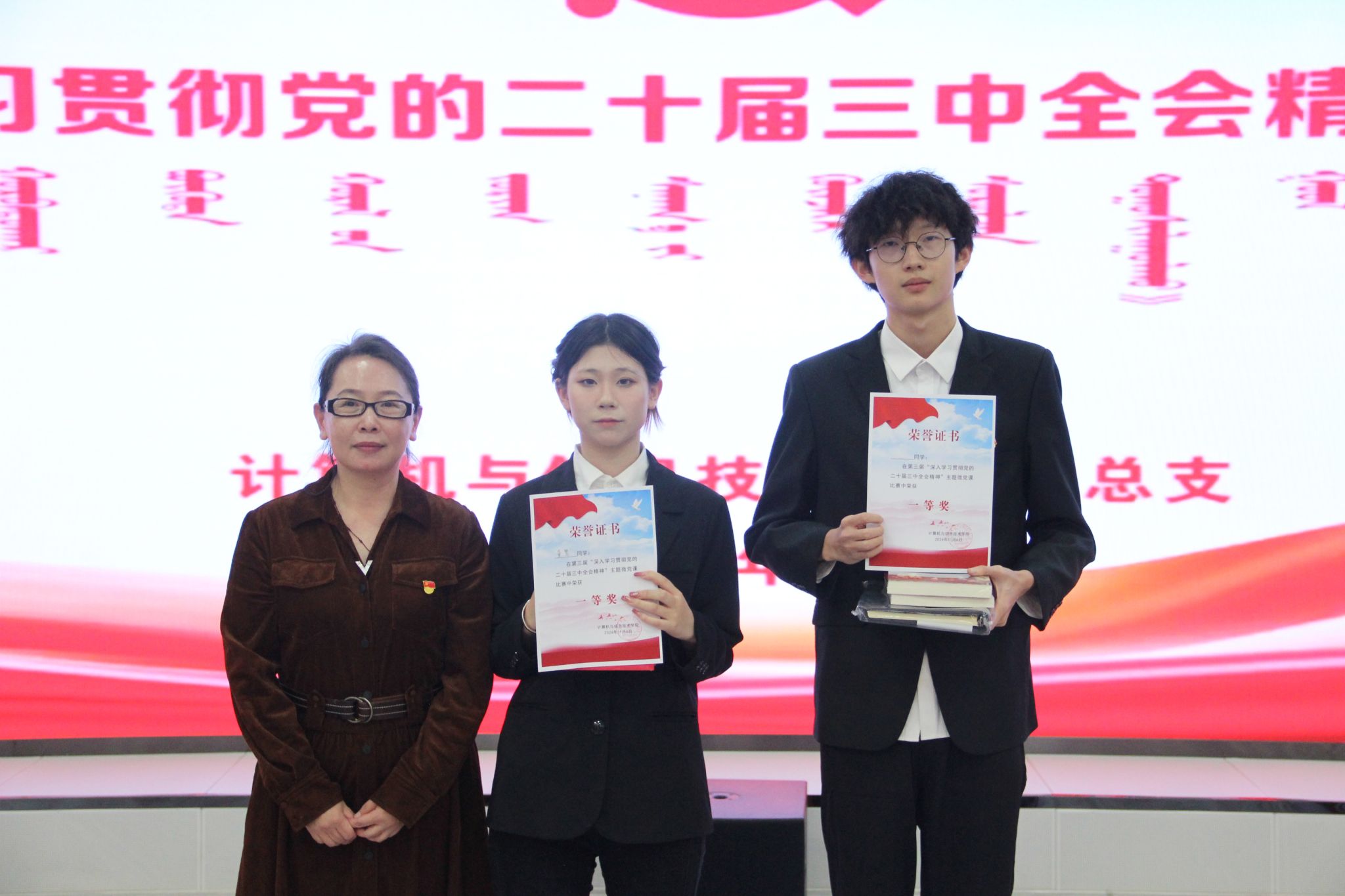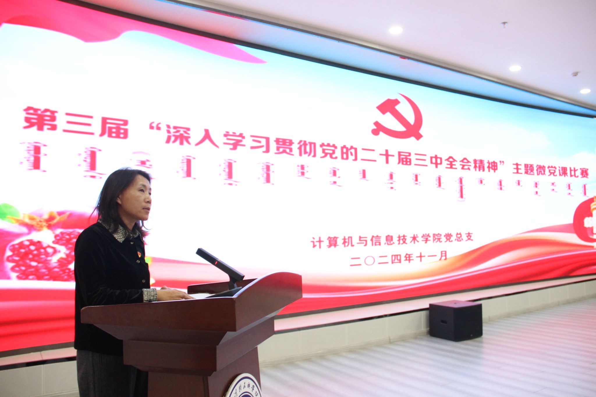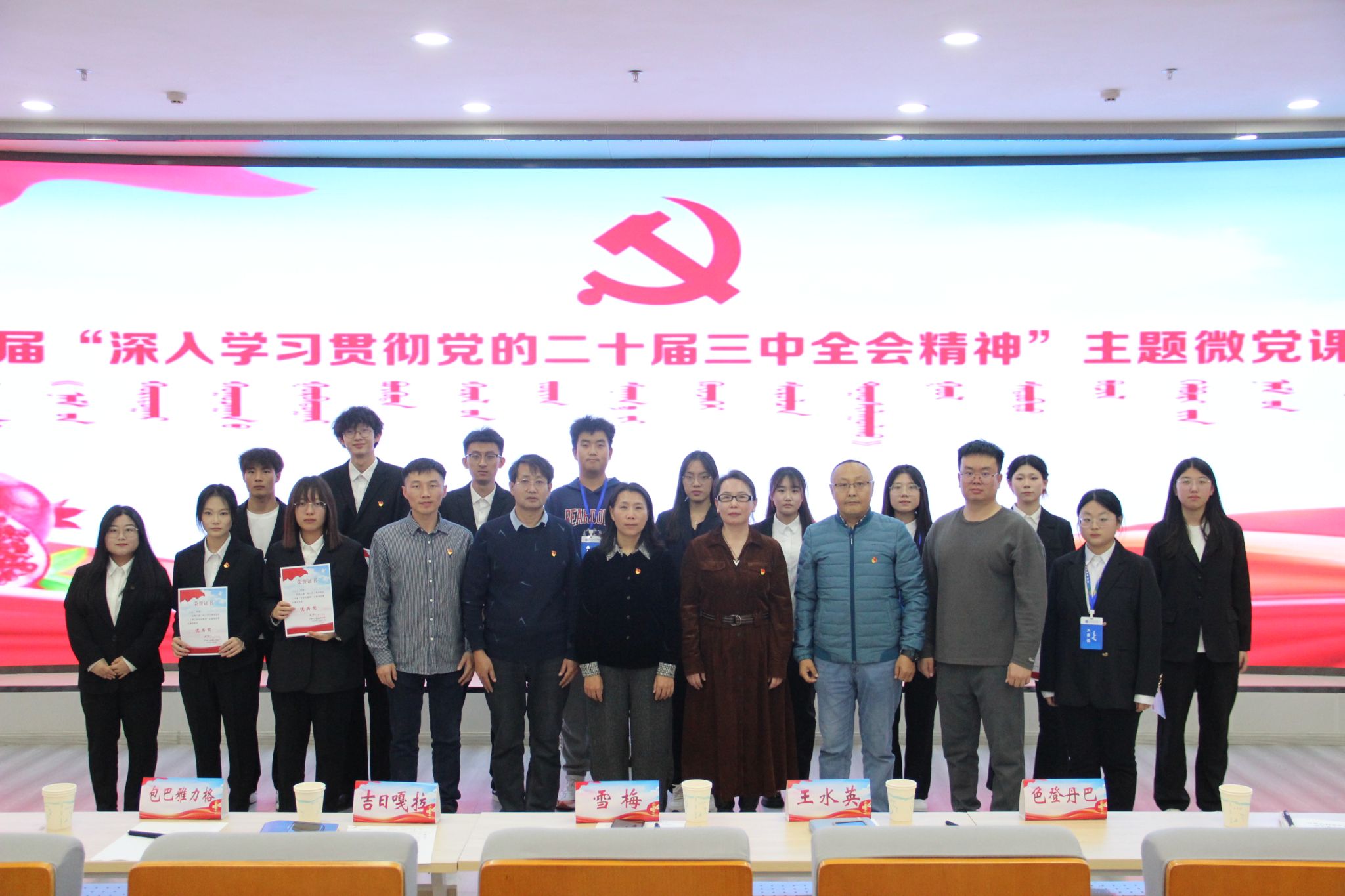 为了深入学习贯彻党的二十届三中全会精神,强化党的路线方针政策,加强学生党员党性修养,我院于11月7日晚在北图书馆一楼报告厅举办了第三届“深入学习贯彻党的二十届三中全会精神”主题微课堂比赛。出席本次比赛的嘉宾有财务处处长雪梅、民族学学院吉日嘎拉教授、学院党总支书记王水英、学院党总支副书记色登丹巴及团总支书记包巴雅力格。
