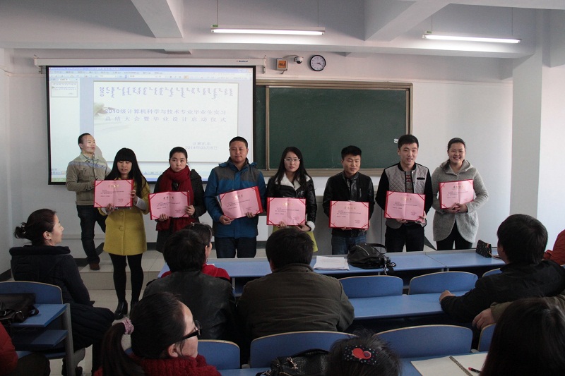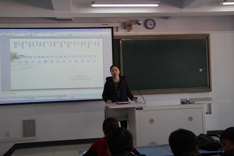 2014年3月6日,计算机系在新教学楼506教室召开了2010级计算机科学与技术专业毕业实习总结大会暨毕业设计启动仪式。计算机系娜党总支书记布其玛、系副主任苏布达、各实习指导教师及全体2014届毕业生参加了会议。
