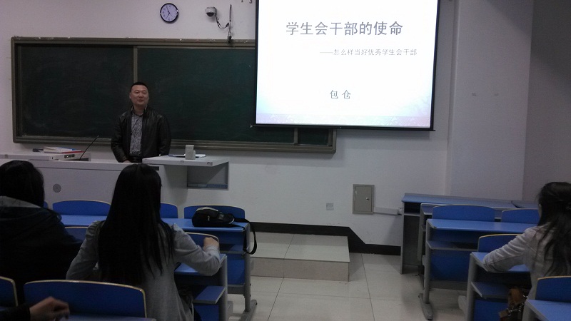 包仓老师主要以新时期学生干部的使命、学生干部的角色意识和如何提升学生会干部的素质等方面进行了阐释,并向在场的同学们提出“学生会的概念及宗旨是什么”、“加入学生会的目的是什么”