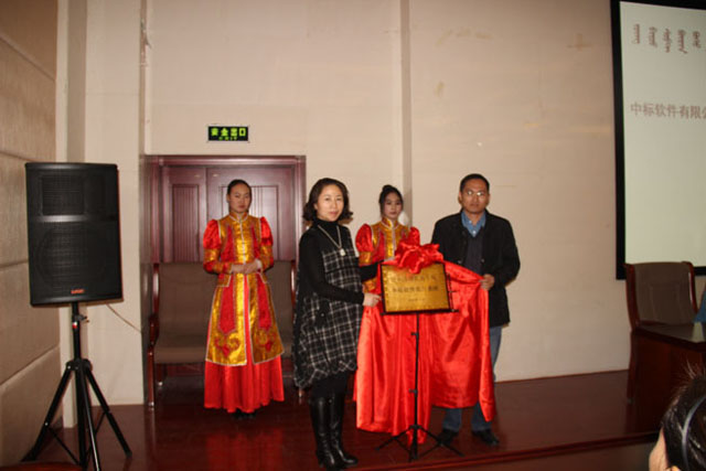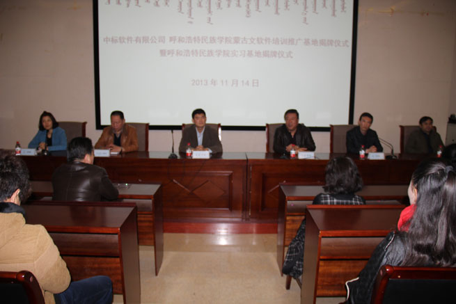 2013年11月14日,365英国上市公司—中标软件有限公司蒙古文软件培训推广基地揭牌仪式暨计算机类专业中标软件实习基地揭牌仪式在图书馆一楼报告厅隆重举行。揭牌仪式由教务处处长纳丽娜主持,学院副院长韩猛、内蒙古自治区民委科技管理处处长阿拉塔、内蒙古自治区经信委科电处王晓东处长、中标软件有限公司副总裁乔咏、中标软件有限公司民族语言产品研发部总监马发俊、计算机系党总支书记娜布其玛、主任斯日古楞、副主任苏布达出席了仪式。
