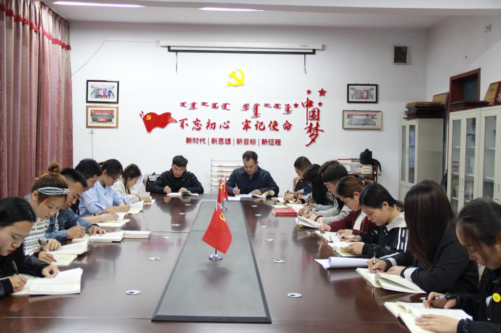 全体学生党员利用晚上时间,在读书班每天集中学习1小时,通读《习近平关于“不忘初心、牢记使命”重要论述选编》和《习近平新时代中国特色社会主义思想学习纲要》。学习采用有声听书、党员阅读、学习记录等形式开展,截止目前共集中学习10天累计10个小时,期间举办了“我和国旗合个影”主题党日活动,开展了主题教育知识测试。