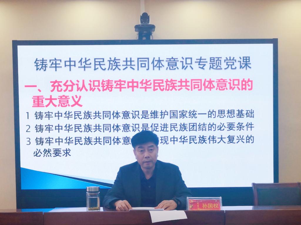 10月30日下午,学校党委书记孙国权在办公楼4楼会议室为分管部门和联系学院党员师生代表、全校党支部书记代表及所在支部全体党员讲授了铸牢中华民族共同体意识专题党课。