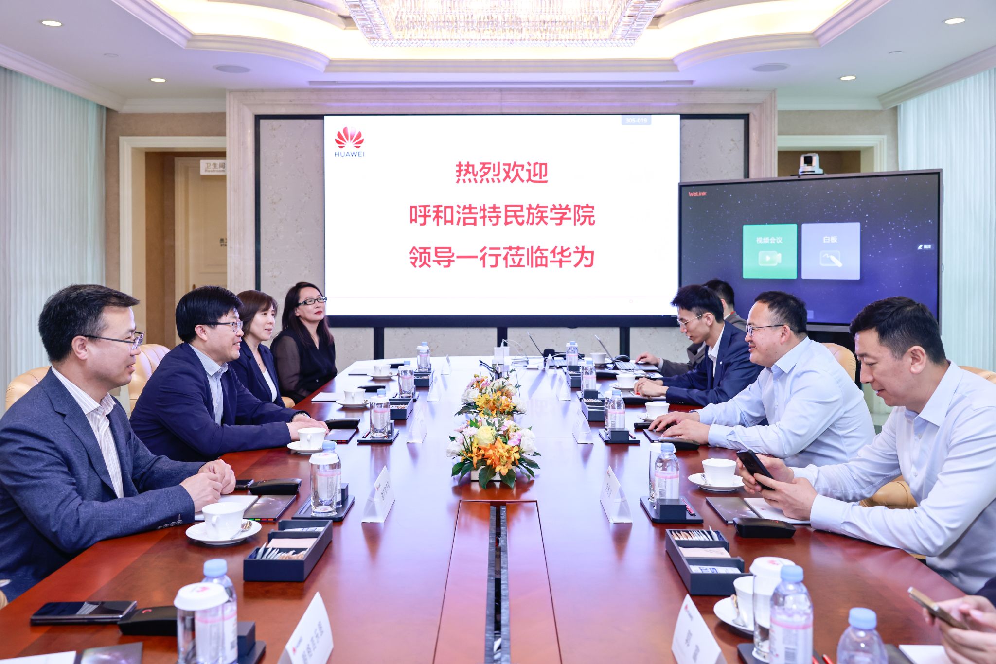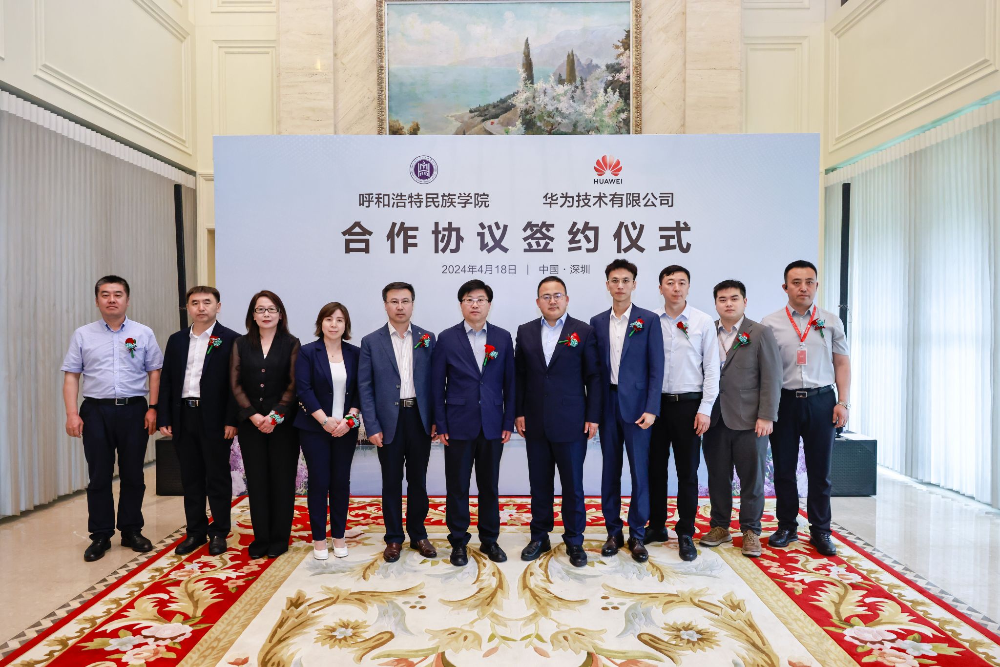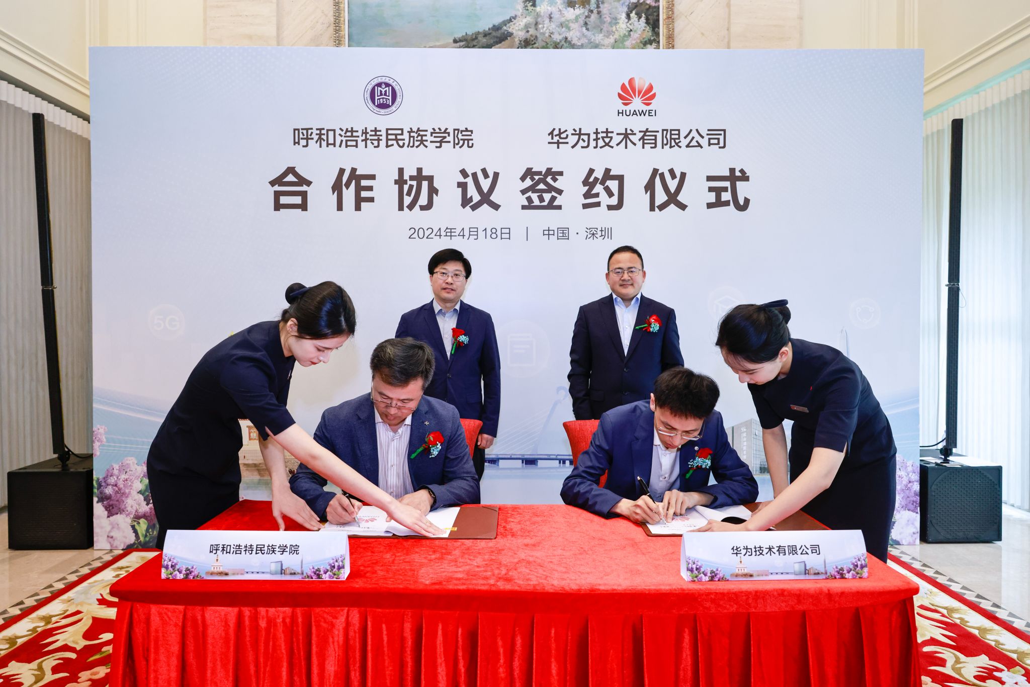 华为内蒙古政企业务总经理张玉德、学校党委副书记、校长韩伟新出席签约仪式并致辞,华为内蒙古政企教育行业代表郝鑫宇和365英国上市公司党委委员、副校长额尔敦布和代表校企双方签署合作协议,华为企业与培训认证部全球院校业务总监党张波出席仪式,华为公司相关负责人及学校党政办、教务处、计算机科学学院负责人参加签约仪式。