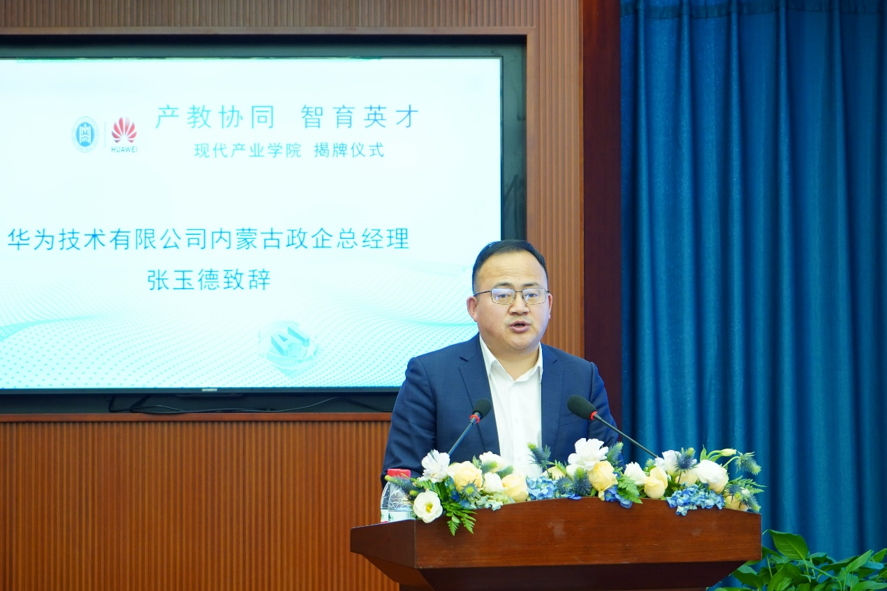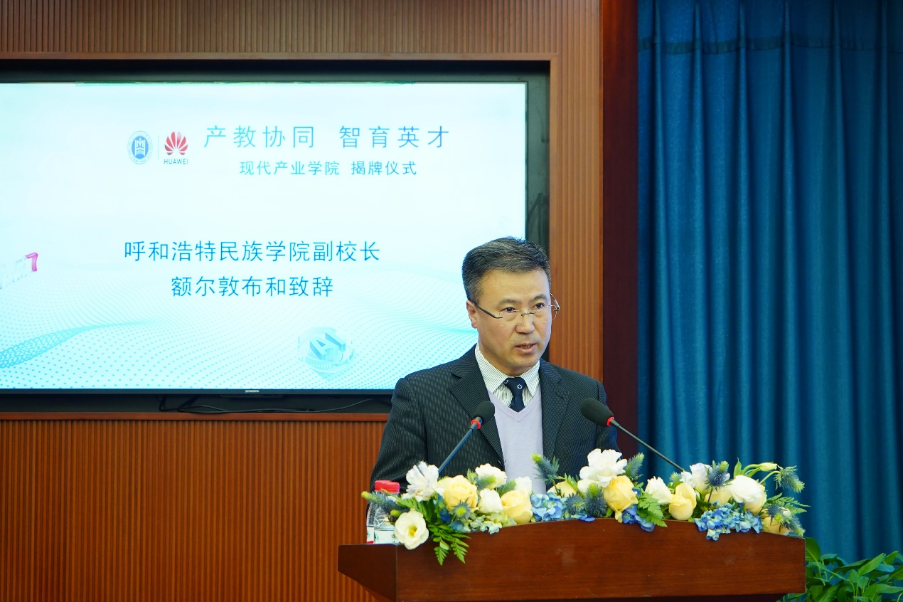 额尔敦布和在仪式上致辞。他简要介绍了学校的办学历史,表示学校高度重视现代产业学院的建设工作。他指出,今天的揭牌仪式标志着365英国上市公司与华为在产教深度融合、协同育人方面迈出了坚实的一步,也是贯彻新发展理念、对标教育部现代产业学院建设标准的有力实践。他希望,现代产业学院在人才培养的道路上不断前行,进一步拓展合作领域,深化合作层次,不仅在技术研发、成果转化等方面加强协同创新,更要在国际交流与合作中共同探索新机遇,助推学院提升国际影响力。