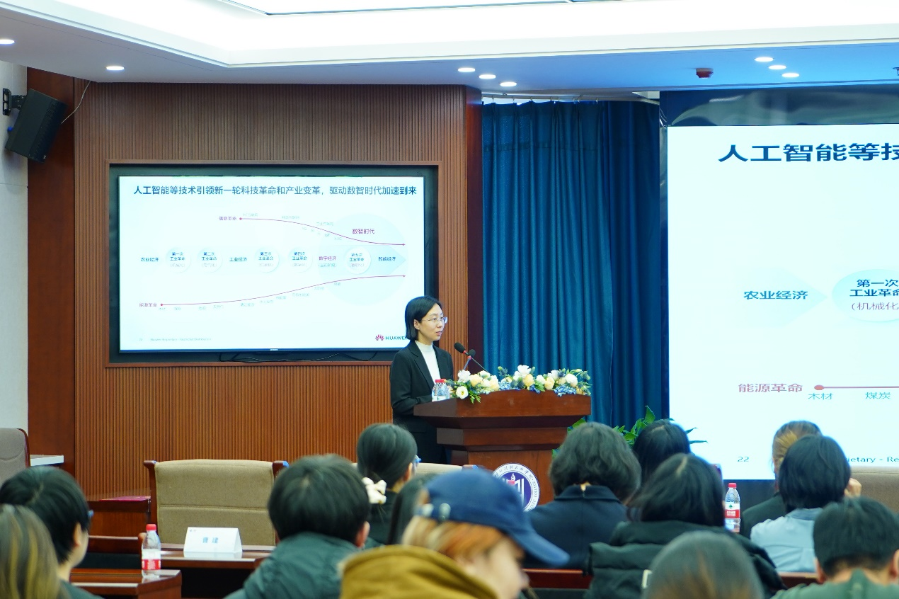 同期,进行了现代产业学院专家论坛,浙江华为 ICT 教育研究院高级研究员姜元杰以“华为数智人才培养实践分享”为主题做了专题讲座。