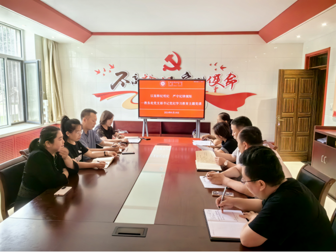 根据学校《党纪学习教育实施方案》要求,为扎实推进党纪学习教育,6月18日上午,教务处党支部在办公楼103会议室开展支部书记党纪学习教育主题党课。党支部书记肖查娜以《以案释纪明纪,严守纪律规矩》为题,通过深入剖析典型案例,教导全体党员干部以此为镜,警醒自我,明确纪律,坚定规矩。