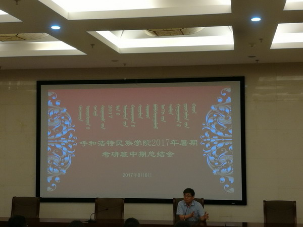 会上,阿拉坦仓副院长做了暑期考研班中期总结重要讲话。他指出,举办考研辅导班充分说明了学校对考研工作的高度重视,提高考研录取率也是学校办学层次和教学质量的重要体现。他用亲身经历来鼓励学生,希望参加考研的同学认识到考研的重要性,提高信心、坚持到底、认真规划、持之以恒。