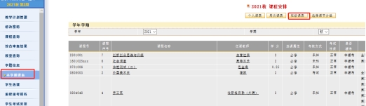 登录教务管理系统→教学计划管理→个人教学计划→学期模式(可看到2021秋季所需要选的所有课程,图1)→根据教学计划中的课程查看班级课表(图2)→根据班级课表选择课程(图3)→快速选课(图4)→输入课程号和课序号选课(显示在班级课表上,图5)→选课完成。