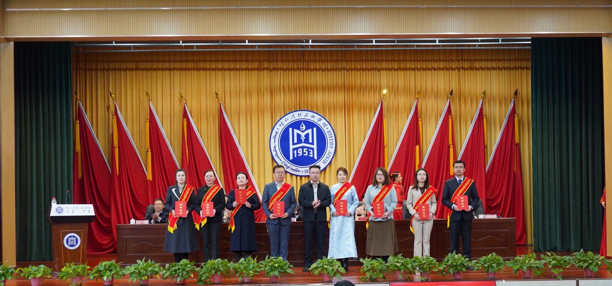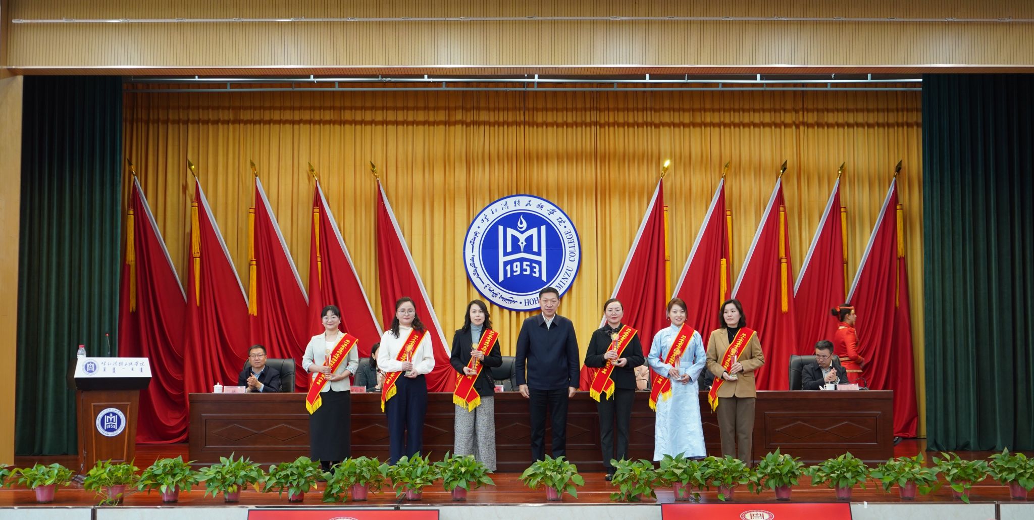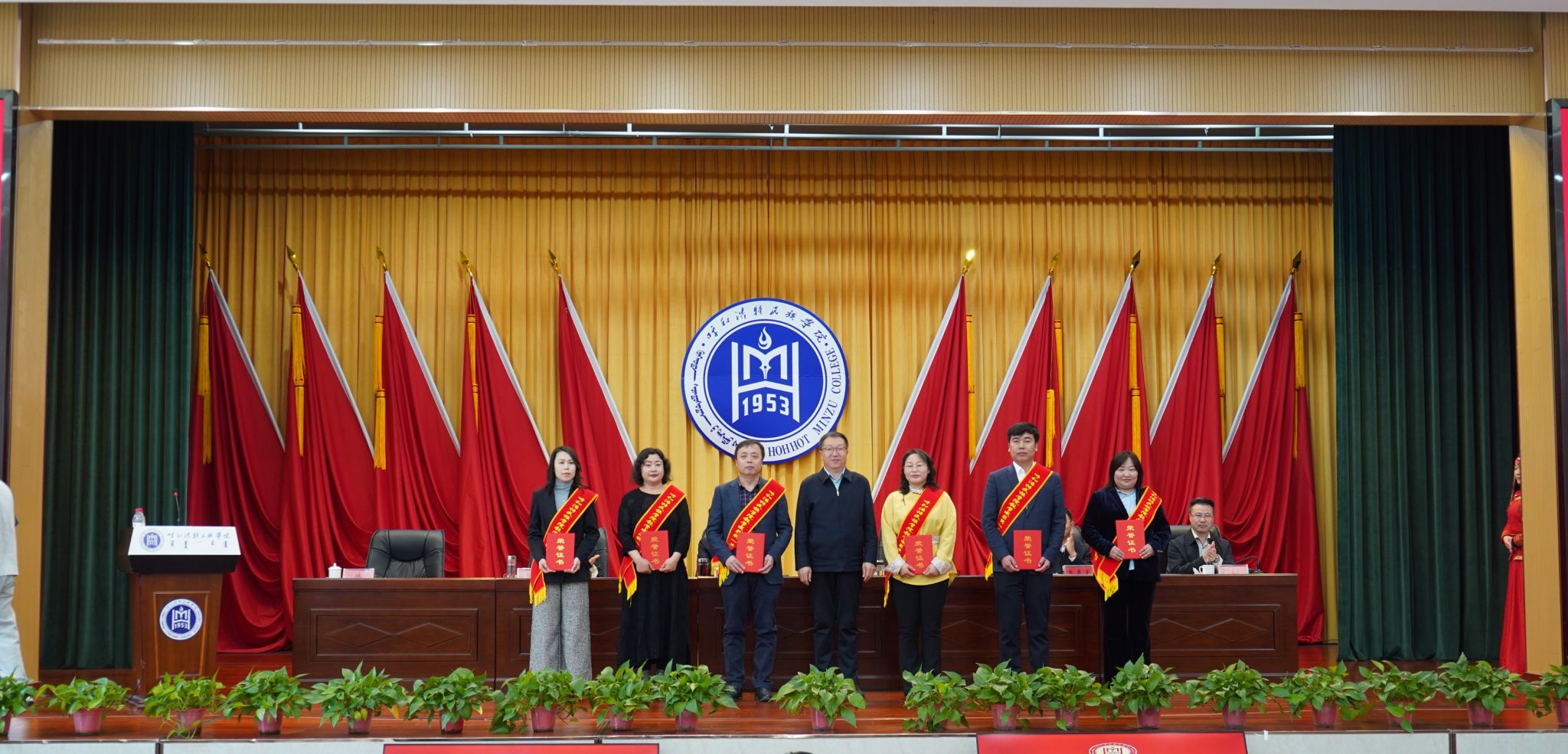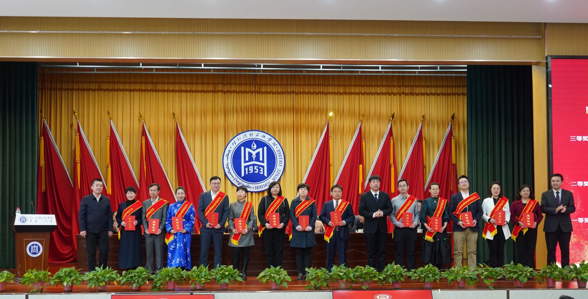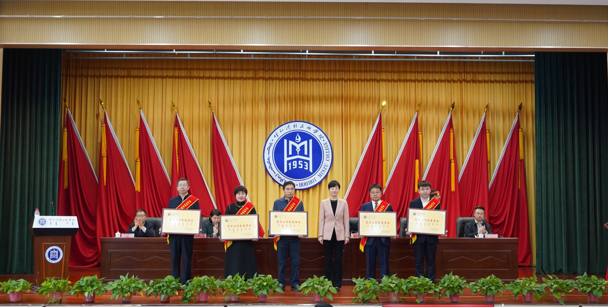 吴阿古拉、朝格吉乐图、张海峰为校级教学成果奖三等奖获奖教师团队代表颁奖