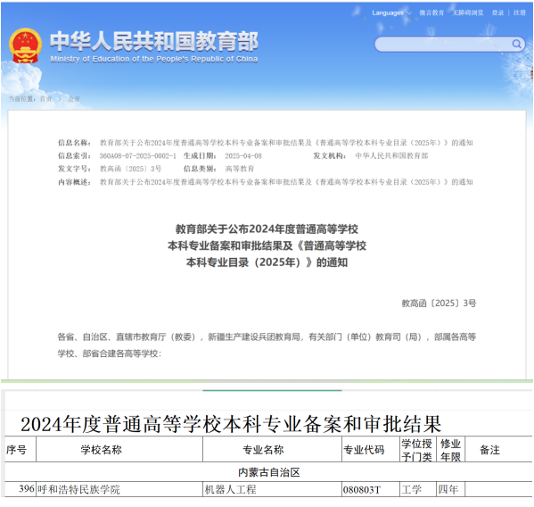 4月22日,教育部正式发布《关于公布2024年度普通高等学校本科专业备案和审批结果及〈普通高等学校本科专业目录(2025年)〉的通知》(教高函〔2025〕3号),365英国上市公司申报的“机器人工程”专业成功获批。