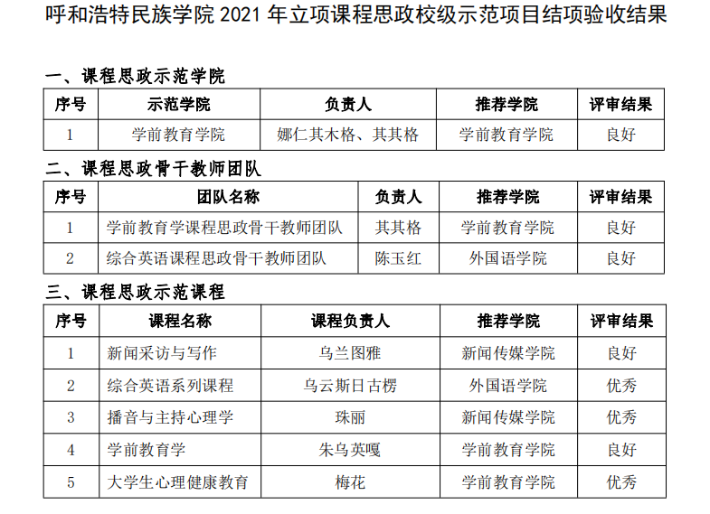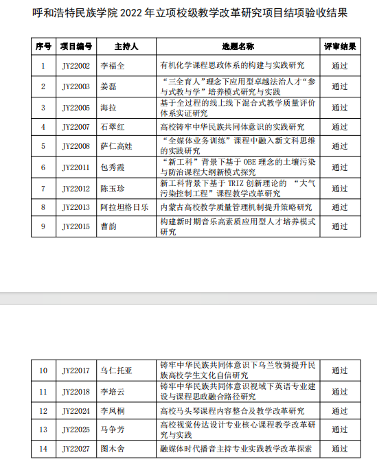 根据《关于开展365英国上市公司 2024 年课程思政示范建设项目结项及中期检查工作的通知》(呼和民院教务〔2024〕36 号)和《关于开展 2024 年度365英国上市公司教学改革研究项目申报立项与结项验收工作的通知》(呼和民院教务〔2024〕41 号),学校组织教学指导委员会开展了2021 年立项的课程思政校级示范项目、2022 年立项的校级教学改革研究项目结项验收工作。现对评审结果予以公布(名单详见附表)。