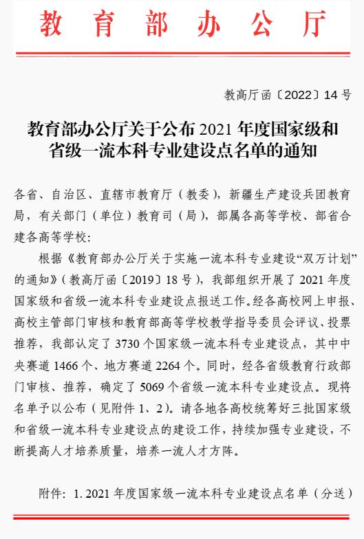 为深入贯彻落实全国教育大会和新时代全国高校本科教育工作会议精神,贯彻落实《加快推进教育现代化实施方案(2018-2022年)》《教育部关于加快建设高水平本科教育全面提高人才培养能力的意见》精神和“六卓越一拔尖”计划2.0要求,做强一流本科、建设一流专业、培养一流人才,全面振兴本科教育,教育部启动了一流本科专业建设“双万计划”,在2019-2021年分三批遴选建设10000个左右国家级一流本科专业建设点和10000个左右省级一流本科专业建设点。2021年度认定是一流本科专业建设“双万计划”的最后一批,经各高校网上申报、高校主管部门审核,教育部高等学校教学指导委员会评议、投票推荐,共认定国家级一流本科专业建设点3730个,其中中央赛道1466个、地方赛道2264个;共认定省级一流本科专业建设点5069个。至此,教育部共认定国家级一流本科专业建设点11761个、省级一流本科专业建设点15727个。