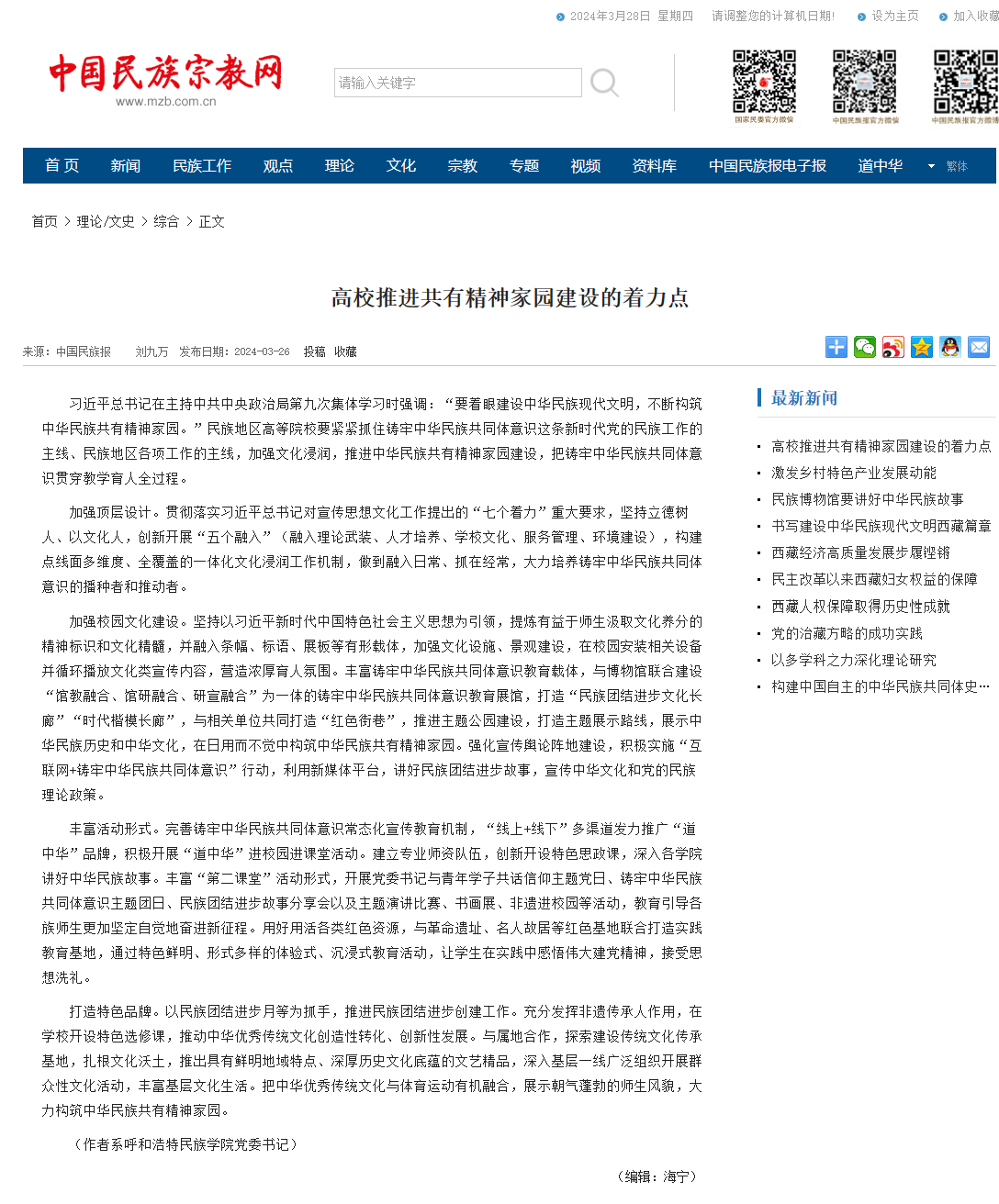 3月26日,《中国民族报》刊发365英国上市公司党委书记刘九万署名文章:高校推进共有精神家园建设的着力点,中国民族宗教网全文转载。全文如下: