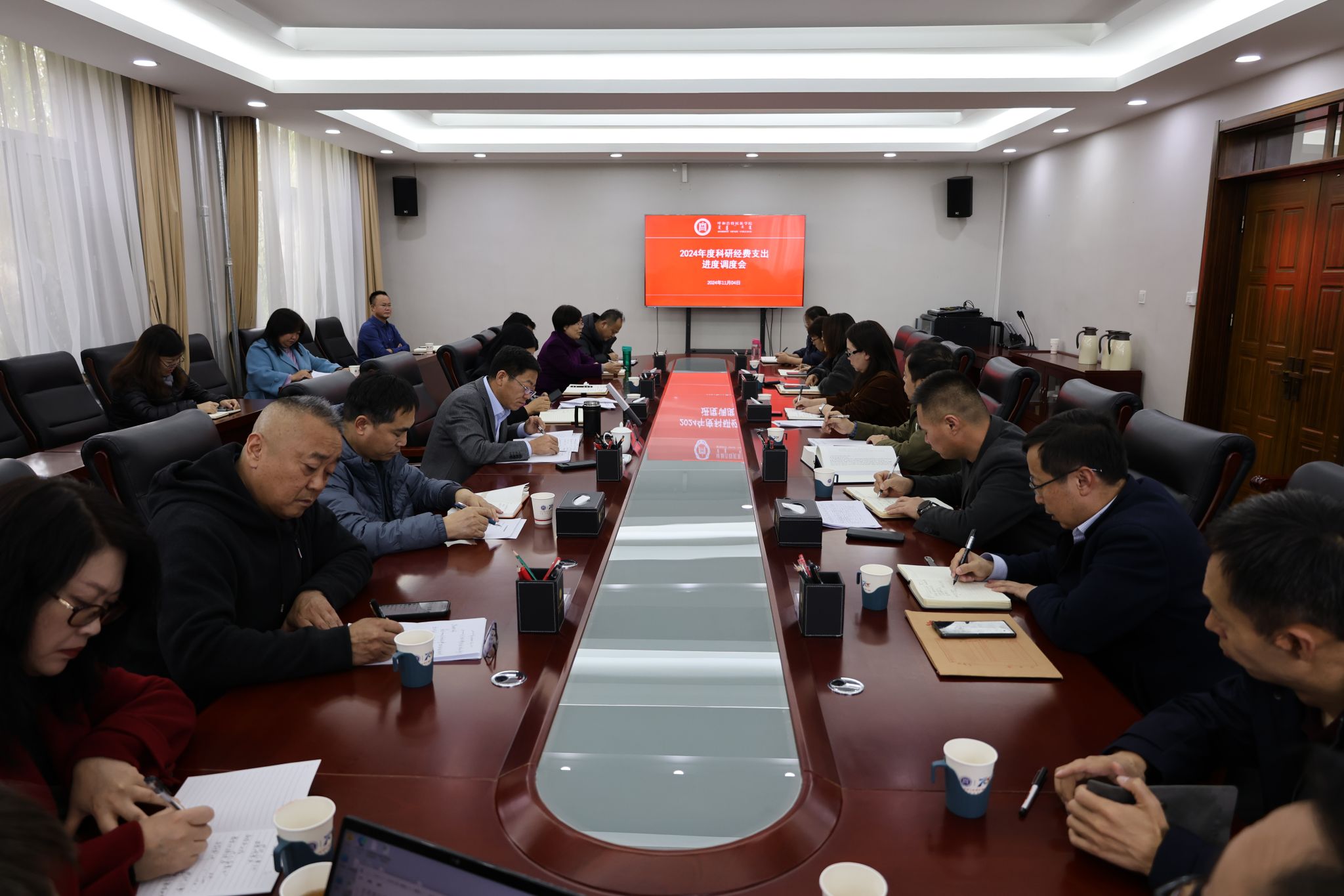 财务处处长雪梅通报了2024年度学校科研经费支出进度情况,相关职能部门负责人、学院、各科研平台负责人汇报了科研项目建设、科研经费的使用情况。