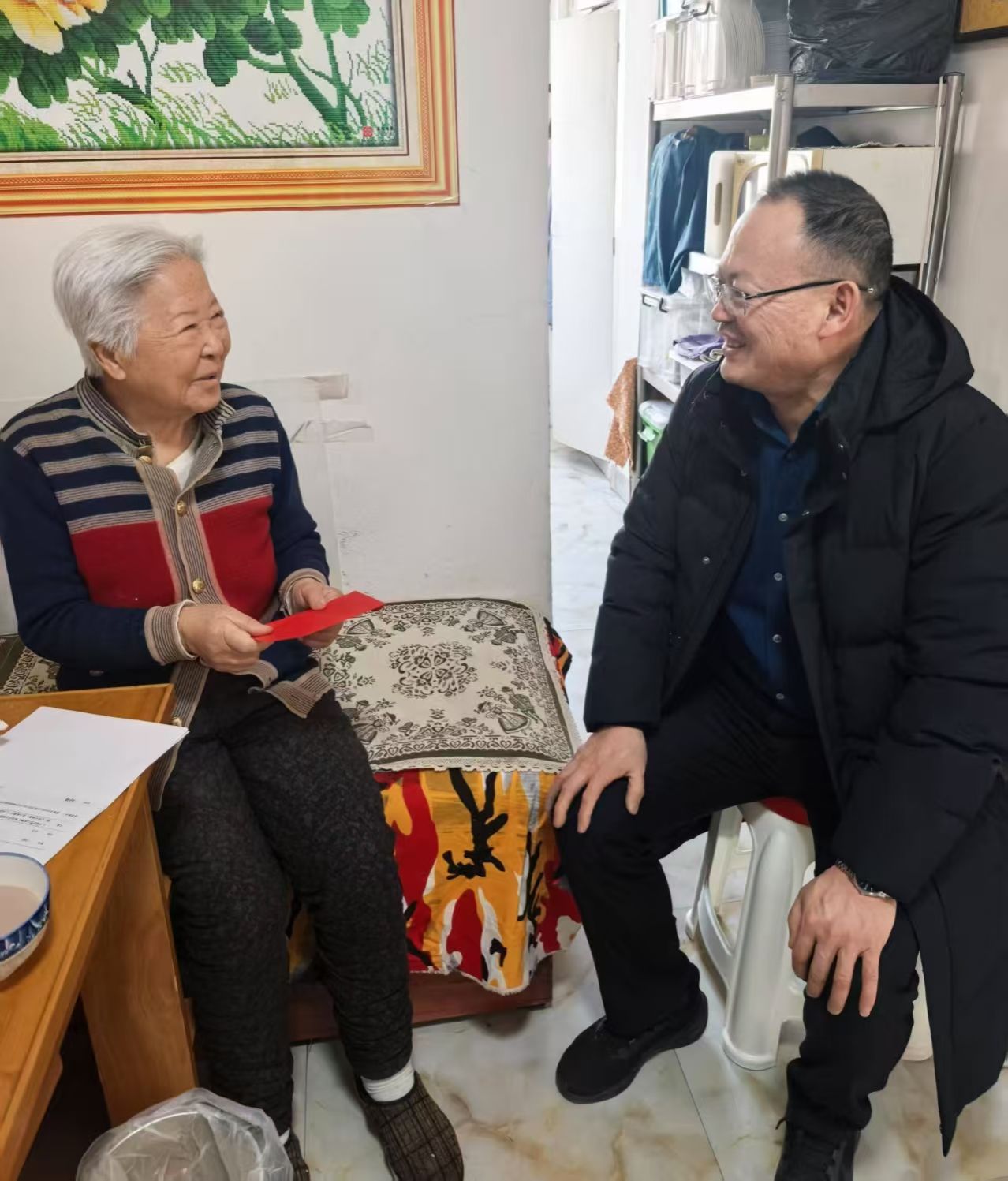楚处长与老同志亲切交谈,详细询问身体状况和生活情况,耐心倾听意见建议,叮嘱老人家保重身体,并传达学校的关心和关怀